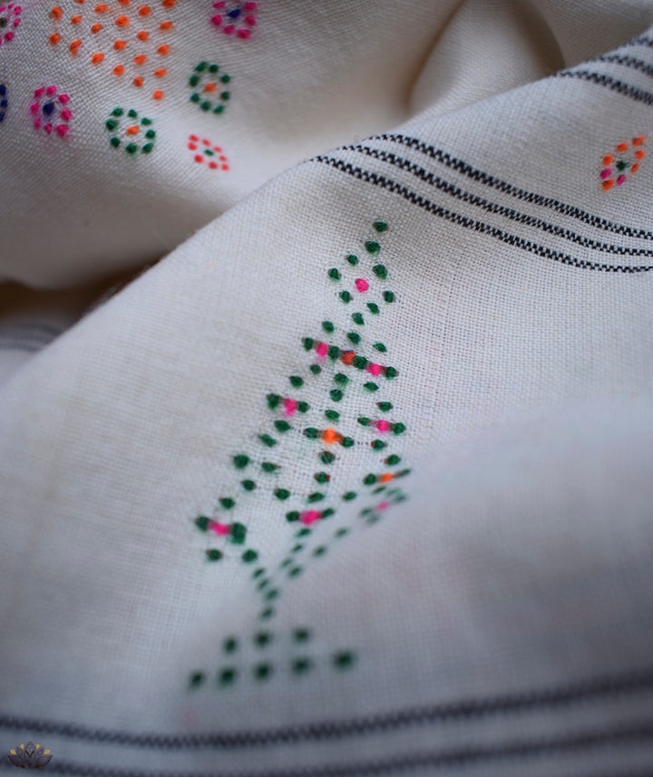 Tangaliya PURE MERINO WOOL Shawl: Tangaliya Woolen Shawl is one of the 100 varieties of product that can be made through using the craft Tangaliya. Its a handwoven process in which a weaver painstakingly goes through the 20 days process with the same amount of love and enthusiasm. As this product is hand woven and it might have slight irregularities that are a natural outcome of the human involvement in the process. About: Tangaliya is 700 years old traditional hand weaving technique. Legend tells us that centuries ago, in the stark landscape of Saurashtra, a Bharwad man married a woman from the weaver community amidst great opposition from both sides. Nevertheless, it was a marriage that would forever influence the rich tapestry of Indian craft. The children born to them were known as Dangasia, and they created the art of Tangaliya weaving. \n \nTangaliya weaving, also known as Daana weaving is practiced in Surendranagar district of Gujarat. This form of weaving not only requires high skill but also an eye for accuracy. The Tangaliya shawl — which uses a unique weaving technique and was almost on the verge of extinction— has been given GI (Geographical Indications) recognition by the Central government. \n \nTangaliya is a labor-intensive and painstaking process. Contrasts colored threads are twisted onto a group of four to five threads of Warp, creating dana, or beadwork. The fabric is constructed in plain weave. The geometric patterns give the impression of delicate embroidery but are actually weaving. The weavers’ fingers sense exactly the right number of warp threads and twist extra weft around them. The result is a glorious geometric pattern, tiny, white dots lighting up rich, dark fabrics. The motif vocabulary of Daana weaving mainly constitutes of the elements present in the community’s environment. Some examples are peacock (mor), plant (jhaad), Naughara, and many more.