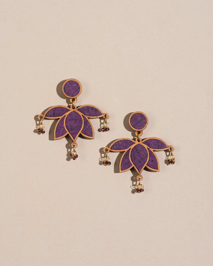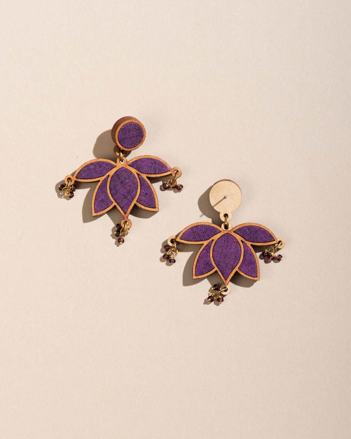 WHE Purple Lotus Upcycled Fabric and Repurposed Wood Statement Earrings