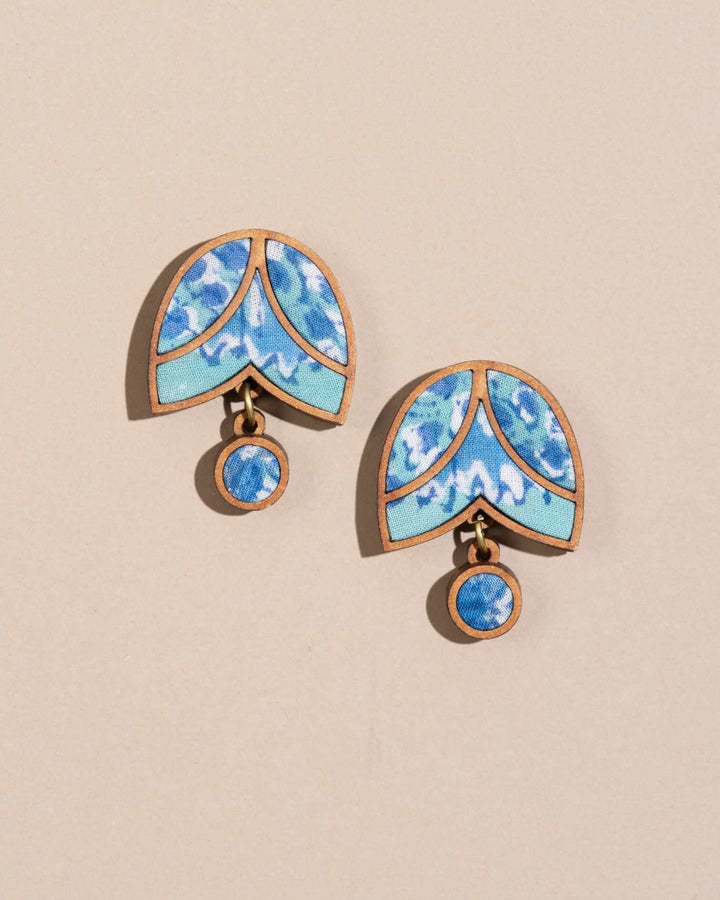 WHE Shades of Blue Bloom Upcycled Fabric and Repurposed Wood Stud Earrings