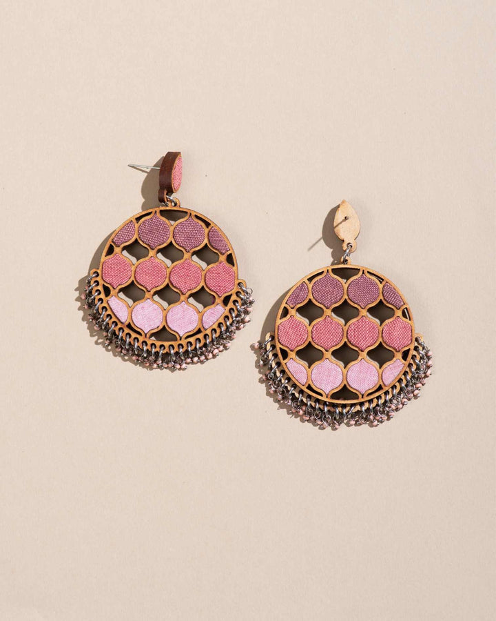 WHE Shades of Pink Upcycled Fabric and Repurposed Wood Statement Earrings