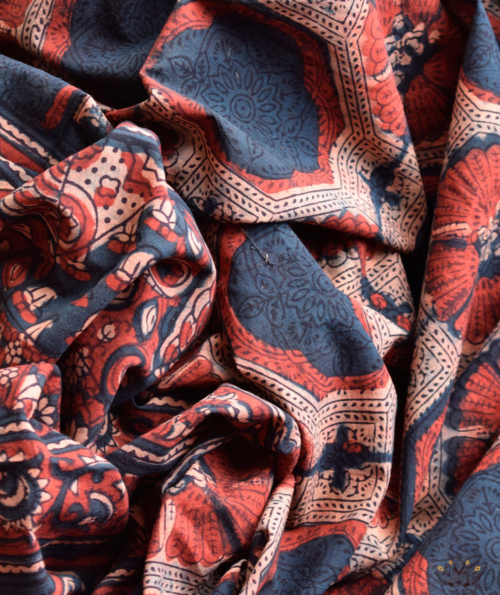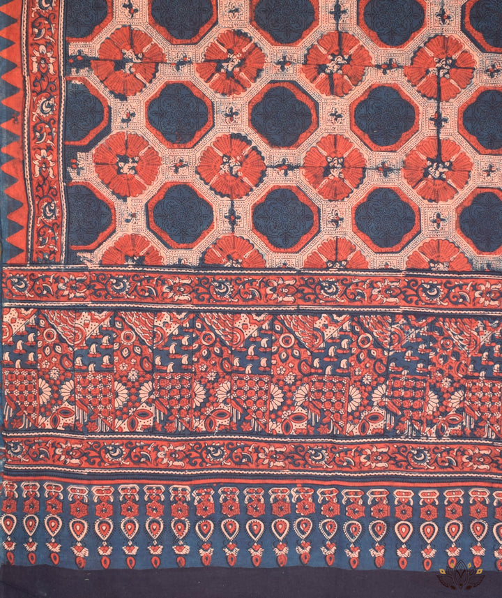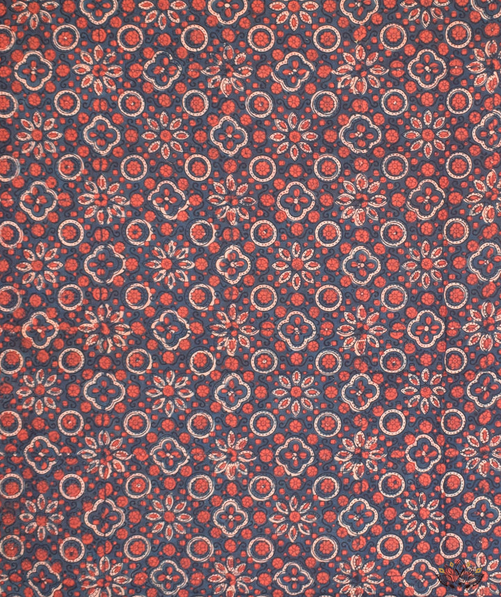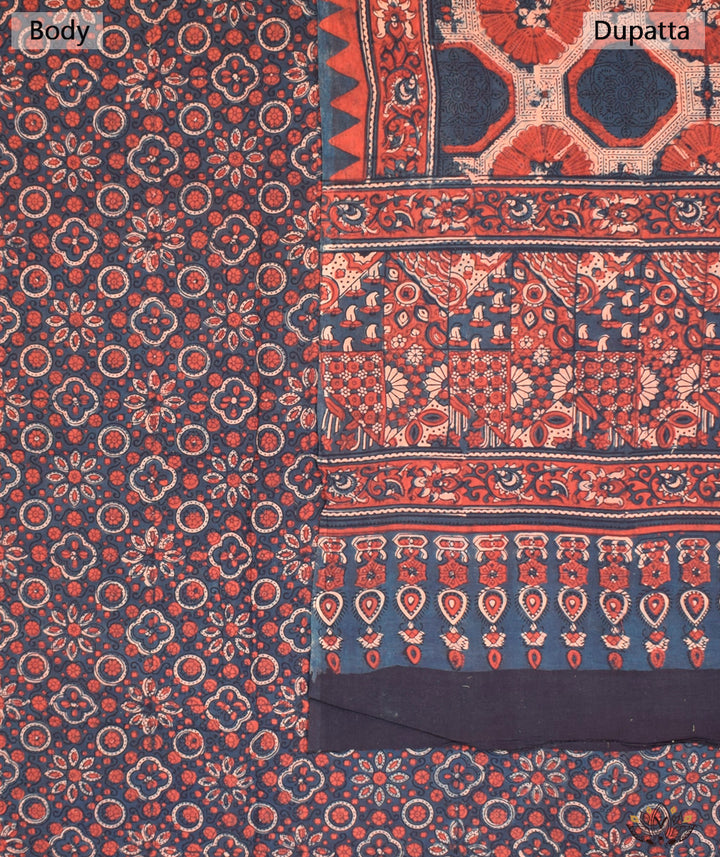 Ajrakh cotton suit piece : Ajrakh cotton suit piece is one of the 100 varieties of product that can be made through using the craft Ajrakh. The final print always has dissimilarities and faded colours which adds to its beauty. To make an Ajrakh silk stole an artisan painstakingly goes through the 20 days process with the same amount of love and enthusiasm. About Ajrakh: Against the dull canvas of the Kachchh desert the rich and bold colours of the textiles are strikingly displayed. Ajrak can trace its roots back to 16th century ancestors who came to India from Sindh, bringing with the craft of Ajrakh printing with them. Ajrakh cloth carries many meanings. The popular story amongst local printers is that Ajrakh means “aaj rakh” i.e “keep it today”. It is also linked to azrakh, the Arabic word for indigo. In addition, A blue plant which thrived in the arid ecology of Kachchh until the 1956 earthquake. 2001’s devastating earthquake severely damaged Bhuj, Dhamadka and other villages and towns all over the Kachchh region. In the wake of this tragedy, the Khatris were brought closer together and a new village was created to rebuild their lives and their craft production, aptly named Ajrakhpur (‘place of Ajrakh’). Today there are Khatris living and working in both villages. Ajrakh block printing follows a lengthy and demanding process. In the first place, they prepare the fabric. Its done by tearing un-dyed fabric into 9 meter lengths, washing it to remove starches, wax and impurities and then dying it with myrobalam. Artisans select a wooden block from their collection of blocks carved with traditional designs. The sound of the wooden block being stamped with force onto the table echoes and sounds almost like a heart beating. It is the sound that the craft is still going strong. This first block is coated in lime coupled with Acacia gum and carefully pressed onto the cloth at regular intervals. It acts as a resist. Myrobalan turns the cloth a yellow colour and works as a mordant, helping to fix the dyes. The cloth is laid flat to dry in the hot sun after being calendered. A resist of lime coupled with gum is applied to define the outline of the design. This is known as rekh. If the cloth is to be double sided, this stage is repeated on the reverse side of the cloth. This first block is coated in lime coupled with Acacia gum and carefully pressed onto the cloth at regular intervals. It acts as a resist. Artisans continue the process by selecting and coating blocks in dye, aligning them with previous prints, and pressing them carefully onto the fabric. Jaggery coupled with gram flour are used for black designs; alum and tamarind for red. After each colour of print, artisans rinse and sun-dry the cloth. After the printing is complete, the cloth is washed, dyed in one of many natural colours, and once again laid in the sun to dry.