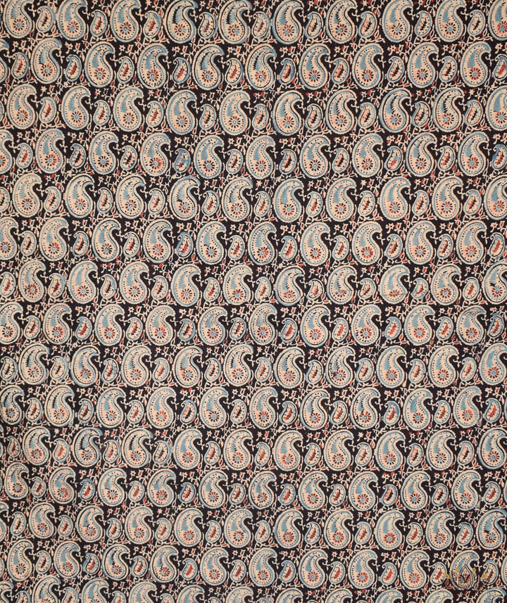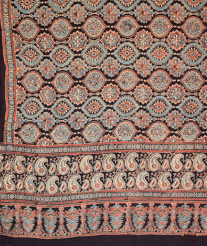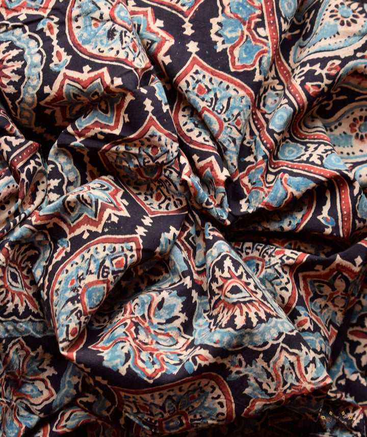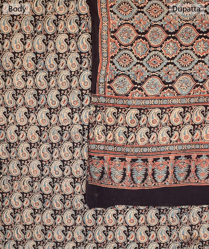 Ajrakh cotton suit piece : Ajrakh cotton suit piece is one of the 100 varieties of product that can be made through using the craft Ajrakh. The final print always has dissimilarities and faded colours which adds to its beauty. To make an Ajrakh silk stole an artisan painstakingly goes through the 20 days process with the same amount of love and enthusiasm. About Ajrakh: Against the dull canvas of the Kachchh desert the rich and bold colours of the textiles are strikingly displayed. Ajrak can trace its roots back to 16th century ancestors who came to India from Sindh, bringing with the craft of Ajrakh printing with them. Ajrakh cloth carries many meanings. The popular story amongst local printers is that Ajrakh means “aaj rakh” i.e “keep it today”. It is also linked to azrakh, the Arabic word for indigo. In addition, A blue plant which thrived in the arid ecology of Kachchh until the 1956 earthquake. 2001’s devastating earthquake severely damaged Bhuj, Dhamadka and other villages and towns all over the Kachchh region. In the wake of this tragedy, the Khatris were brought closer together and a new village was created to rebuild their lives and their craft production, aptly named Ajrakhpur (‘place of Ajrakh’). Today there are Khatris living and working in both villages. Ajrakh block printing follows a lengthy and demanding process. In the first place, they prepare the fabric. Its done by tearing un-dyed fabric into 9 meter lengths, washing it to remove starches, wax and impurities and then dying it with myrobalam. Artisans select a wooden block from their collection of blocks carved with traditional designs. The sound of the wooden block being stamped with force onto the table echoes and sounds almost like a heart beating. It is the sound that the craft is still going strong. This first block is coated in lime coupled with Acacia gum and carefully pressed onto the cloth at regular intervals. It acts as a resist. Myrobalan turns the cloth a yellow colour and works as a mordant, helping to fix the dyes. The cloth is laid flat to dry in the hot sun after being calendered. A resist of lime coupled with gum is applied to define the outline of the design. This is known as rekh. If the cloth is to be double sided, this stage is repeated on the reverse side of the cloth. This first block is coated in lime coupled with Acacia gum and carefully pressed onto the cloth at regular intervals. It acts as a resist. Artisans continue the process by selecting and coating blocks in dye, aligning them with previous prints, and pressing them carefully onto the fabric. Jaggery coupled with gram flour are used for black designs; alum and tamarind for red. After each colour of print, artisans rinse and sun-dry the cloth. After the printing is complete, the cloth is washed, dyed in one of many natural colours, and once again laid in the sun to dry.