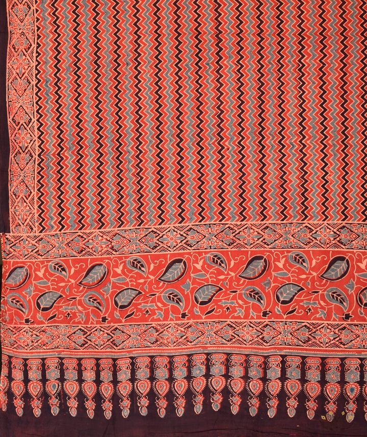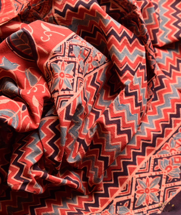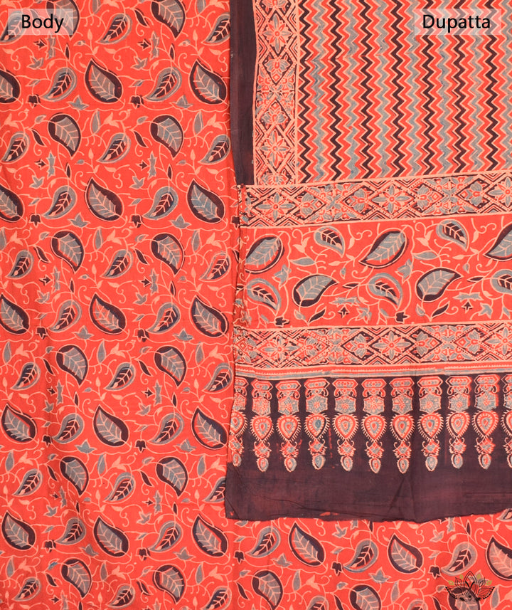 Ajrakh cotton suit piece : Ajrakh cotton suit piece is one of the 100 varieties of product that can be made through using the craft Ajrakh. The final print always has dissimilarities and faded colours which adds to its beauty. To make an Ajrakh silk stole an artisan painstakingly goes through the 20 days process with the same amount of love and enthusiasm. About Ajrakh: Against the dull canvas of the Kachchh desert the rich and bold colours of the textiles are strikingly displayed. Ajrak can trace its roots back to 16th century ancestors who came to India from Sindh, bringing with the craft of Ajrakh printing with them. Ajrakh cloth carries many meanings. The popular story amongst local printers is that Ajrakh means “aaj rakh” i.e “keep it today”. It is also linked to azrakh, the Arabic word for indigo. In addition, A blue plant which thrived in the arid ecology of Kachchh until the 1956 earthquake. 2001’s devastating earthquake severely damaged Bhuj, Dhamadka and other villages and towns all over the Kachchh region. In the wake of this tragedy, the Khatris were brought closer together and a new village was created to rebuild their lives and their craft production, aptly named Ajrakhpur (‘place of Ajrakh’). Today there are Khatris living and working in both villages. Ajrakh block printing follows a lengthy and demanding process. In the first place, they prepare the fabric. Its done by tearing un-dyed fabric into 9 meter lengths, washing it to remove starches, wax and impurities and then dying it with myrobalam. Artisans select a wooden block from their collection of blocks carved with traditional designs. The sound of the wooden block being stamped with force onto the table echoes and sounds almost like a heart beating. It is the sound that the craft is still going strong. This first block is coated in lime coupled with Acacia gum and carefully pressed onto the cloth at regular intervals. It acts as a resist. Myrobalan turns the cloth a yellow colour and works as a mordant, helping to fix the dyes. The cloth is laid flat to dry in the hot sun after being calendered. A resist of lime coupled with gum is applied to define the outline of the design. This is known as rekh. If the cloth is to be double sided, this stage is repeated on the reverse side of the cloth. This first block is coated in lime coupled with Acacia gum and carefully pressed onto the cloth at regular intervals. It acts as a resist. Artisans continue the process by selecting and coating blocks in dye, aligning them with previous prints, and pressing them carefully onto the fabric. Jaggery coupled with gram flour are used for black designs; alum and tamarind for red. After each colour of print, artisans rinse and sun-dry the cloth. After the printing is complete, the cloth is washed, dyed in one of many natural colours, and once again laid in the sun to dry.