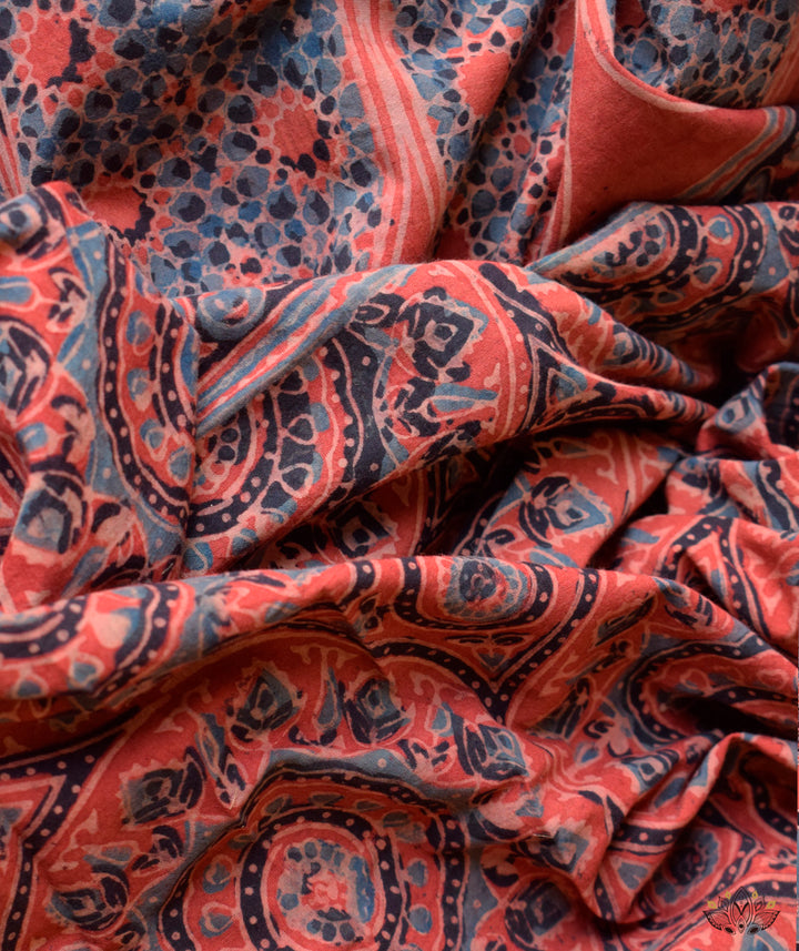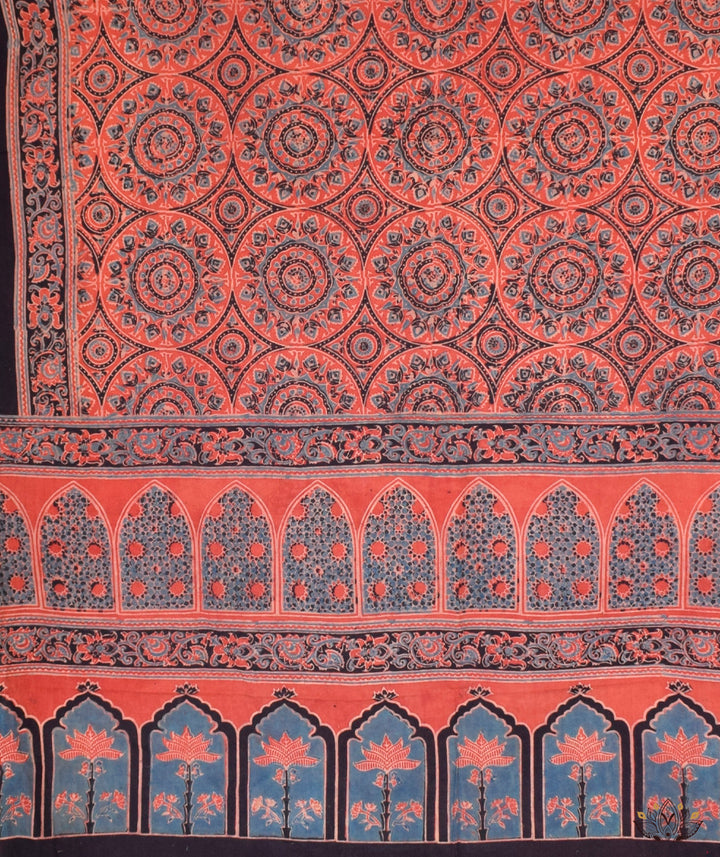 Ajrakh can trace its roots back to 16th century ancestors who came to India from Sindh, bringing with the craft of printing with them. Against the dull canvas of the Kachchh desert, the rich and bold colours of the textiles are strikingly displayed. Ajrakh print or Ajrakh block printing carries many meanings. The popular story amongst local printers is that Ajrakh means “aaj rakh” i.e “keep it today”. It is also linked to azrakh, the Arabic word for indigo. In addition, A blue plant which thrived in the arid ecology of Kachchh until the 1956 earthquake. 2001's devastating earthquake severely damaged Bhuj, Dhamadka and other villages and towns all over the Kachchh region. In the wake of this tragedy, the Khatris were brought closer together and a new village was created to rebuild their lives and their craft production, aptly named Ajrakhpur. Today there are Khatris living and working in both villages.