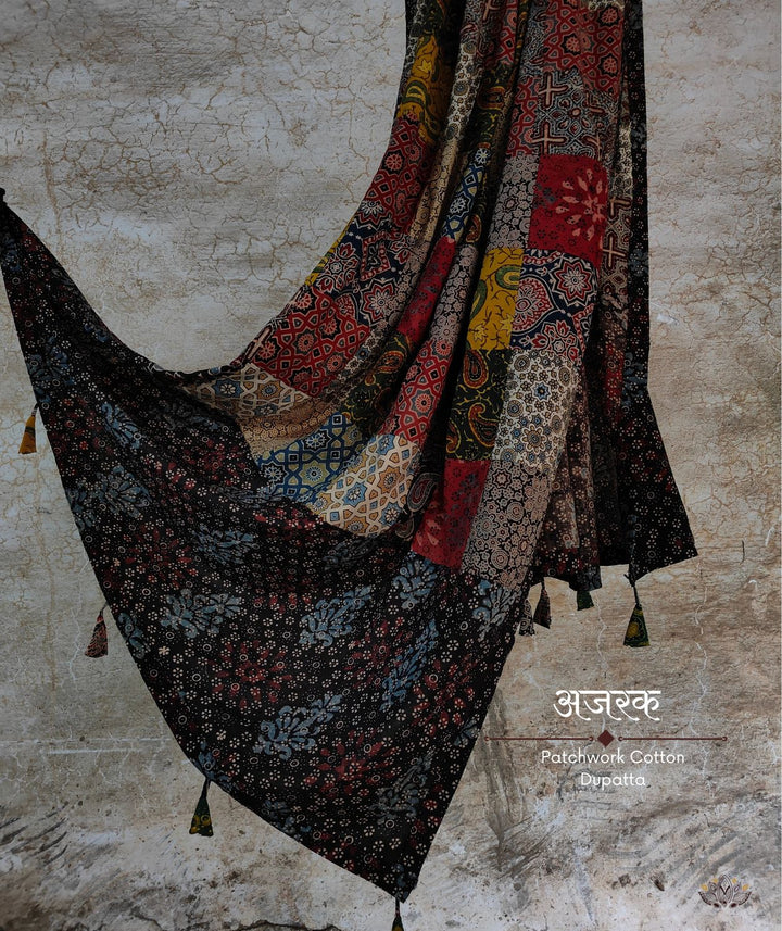 Ajrak is the name given to a block printed fabric with a deep crimson red and indigo blue backdrop, symmetrical designs, and unprinted sparkling white motifs interspersed. The name "Ajrak" may be derived from the Arabic word "Azrak," which means "blue." Blue is one of the primary colours used in Ajrak printing.