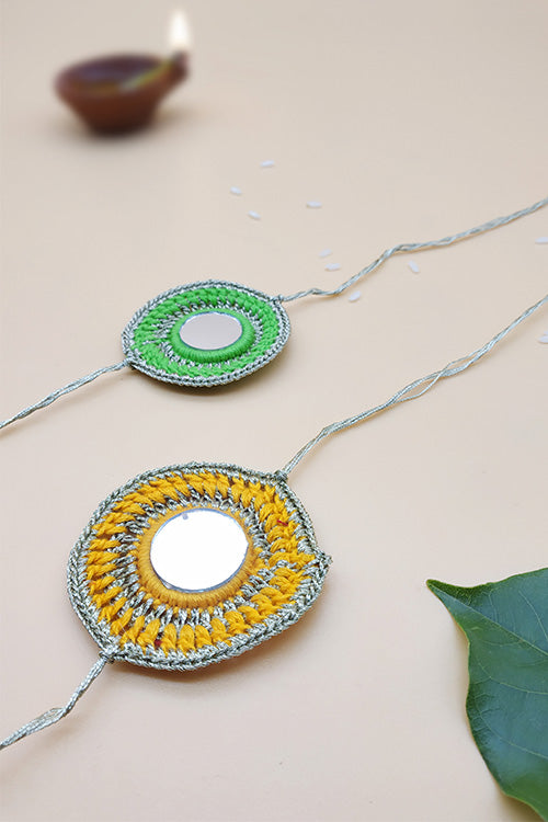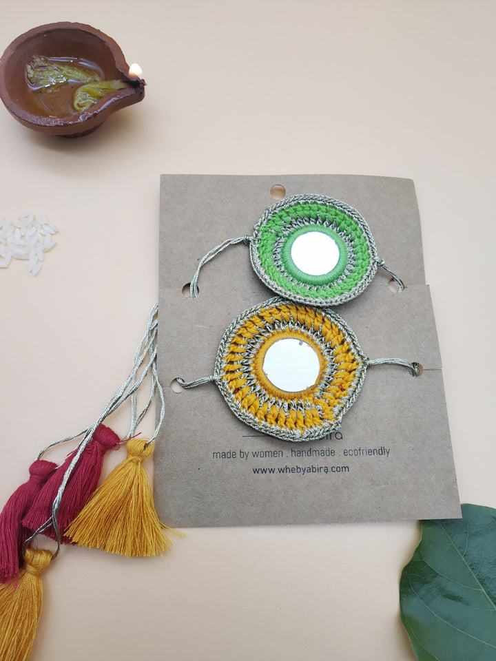 This set of 2 hand crochet rakhi is beautifully ornate with golden zari. Each of them takes about 1.5 hours to finish. Let's celebrate eco friendly rakhi this year while impacting life of women who made them.
