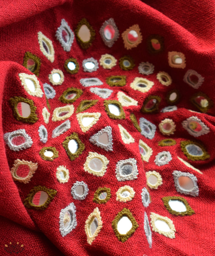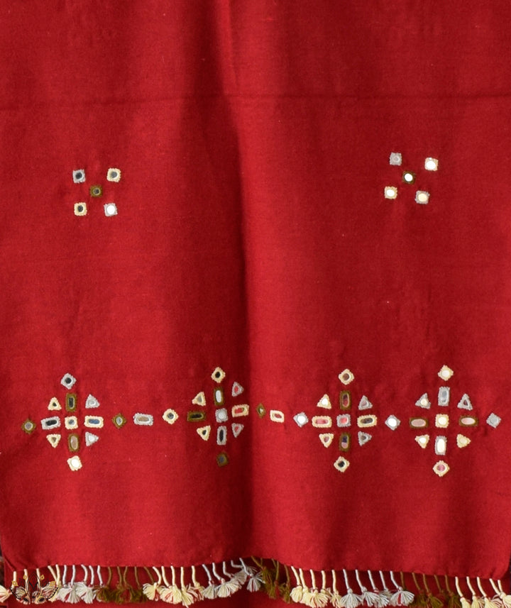 While the men do the weaving, the women are responsible for preparing the warp thread. Since the yarns are too battle when bought, it is first starched in a combination of wheat flour and wild onions which is also an insect deterrent. Once the yarns are starched and dried, it is combed and prepped for the loom. The women swiftly moves her wand or ‘kadani’ over a wooden frame called chaukta. She’s preparing the warp thread, putting together a bundle of exactly 1600 threads of 50 meters each that will be used to create a 39inch width shawl. It will take her six hours of work for about two days to finish the job. Yarn is also prepared into a spindle by some. The yarn comes from Bhujodi, Ludhiana, Rajasthan and Ahmedabad and includes desi and acrylic wool (Marino and local wool), sutar, silk, dori and cotton each used to make an end product catering a different customer. The weft yarn is then prepared by rolling on to small bobbins from the hanks. It is then laid on the loom, where the long thread tana, intersects with bana, the shorter one, hence weaving here is called ‘tana bana‘. In Kutch, two types of shuttle looms are in use, a pit loom, which is on ground level and a shuttle loom that is slightly more structured. The work done in the loom depends on the result one is aiming for. A simple shawl that involves only weaving can take about two days to create and at least 5-6 shawls of the same model will be weaved each time, making a minimum weaving stint last for at least 10 to 12 days. Shawls with intricate designs can take months on end. It was one such magnificently patterned Dhablo or shawl that Vishram Valji, Ramji’s father worked on for an entire year that won him the President’s award in 1974.