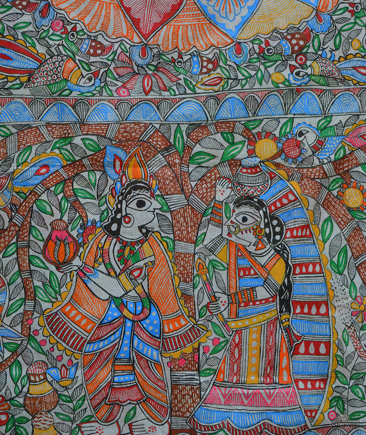 Iconography : Stories of Hindu deities like Krishna, Rama, Lakshmi, Shiva, Durga and Saraswati form the theme for Madhubani Paintings. Also, heavenly bodies like the Sun and the Moon often form the centerpiece of Madhubani paintings.