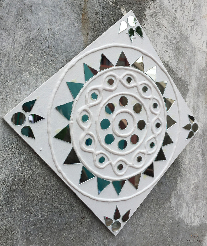 The motifs are inspired from the rich and famous embroidery patterns and once the walls are done they look stunning with mirrors embedded in the mud work, much like the embroideries itself. The mirrors used are called aabhla and come in various shapes - round, diamond & triangular.