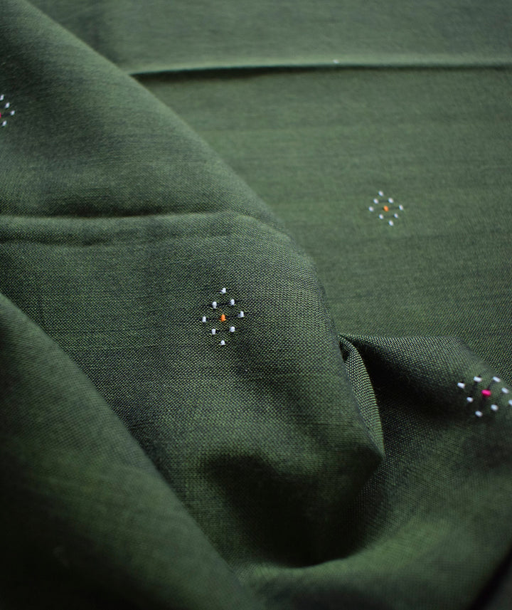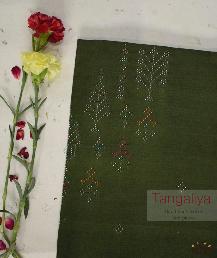 Tangaliya cotton suit piece is one of the 100 varieties of product that can be made through using the craft Tangaliya. Its a handwoven process in which a weaver painstakingly goes through the 20 days process with the same amount of love and enthusiasm. As this product is hand woven and it might have slight irregularities that are a natural outcome of the human involvement in the process.