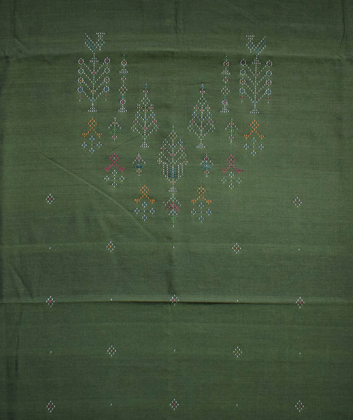 Tangaliya is a labor-intensive and painstaking process. Contrasts colored threads are twisted onto a group of four to five threads of Warp, creating dana, or beadwork. The fabric is constructed in plain weave. The geometric patterns give the impression of delicate embroidery but are actually weaving. The weavers’ fingers sense exactly the right number of warp threads and twist extra weft around them. The result is a glorious geometric pattern, tiny, white dots lighting up rich, dark fabrics. The motif vocabulary of Daana weaving mainly constitutes of the elements present in the community’s environment. Some examples are peacock
