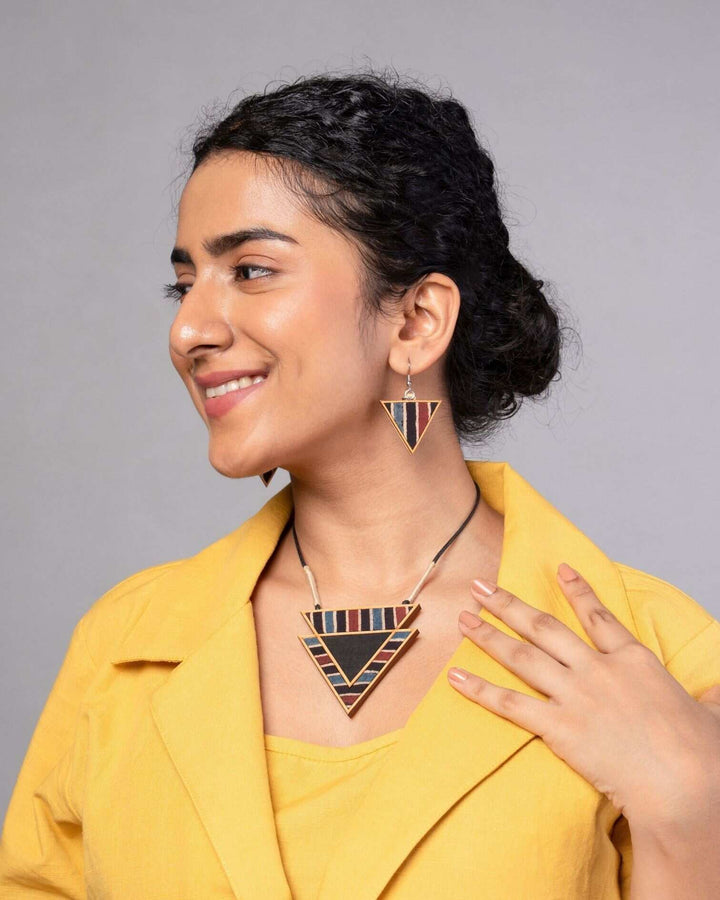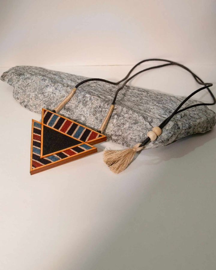 WHE Black Ajrakh Repurposed Fabric and Wood Triangular Necklace