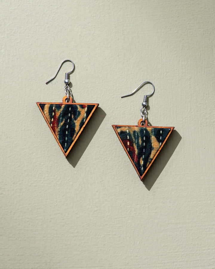 WHE Green Upcycled Fabric and Repurposed Wood Triangular Earrings