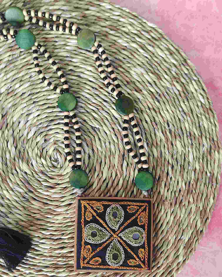 WHE Hand Embroidered Green Pendant Necklace with Beaded String