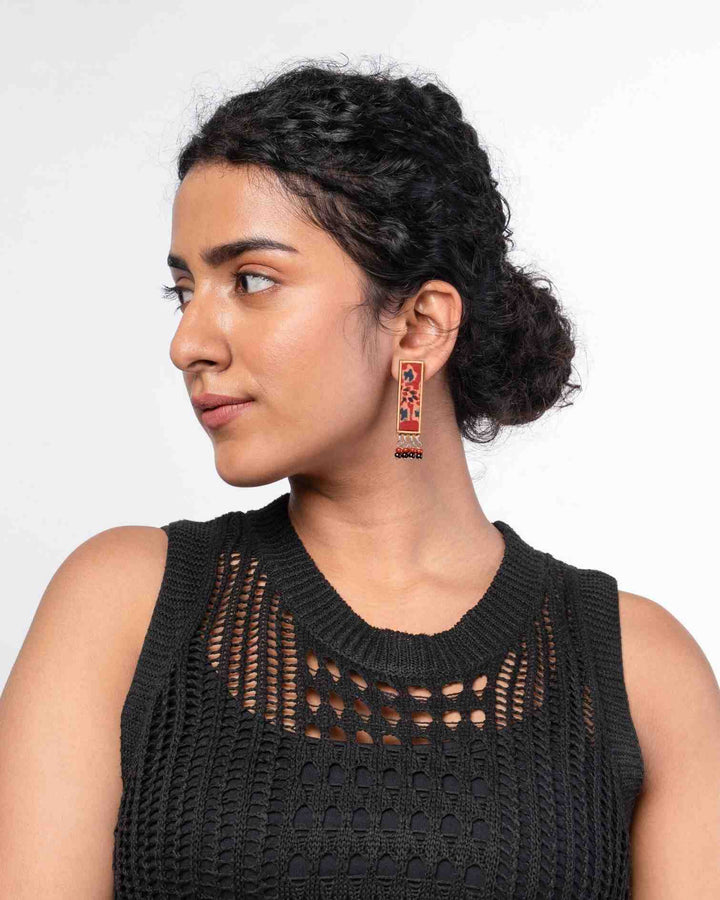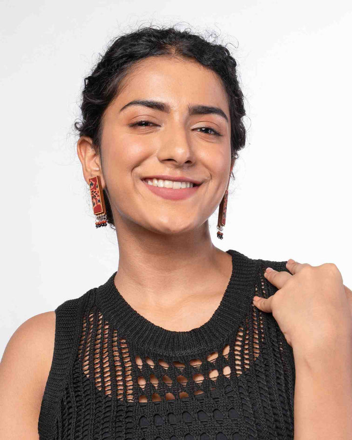WHE Red Ajrakh Repurposed Fabric and Wood Studs with Beads