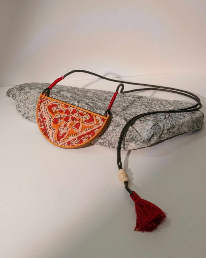 WHE Red Repurposed Kalamkari Fabric and Repurposed Wood Pendant