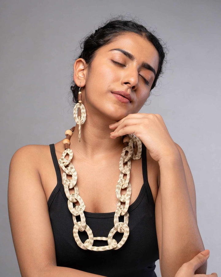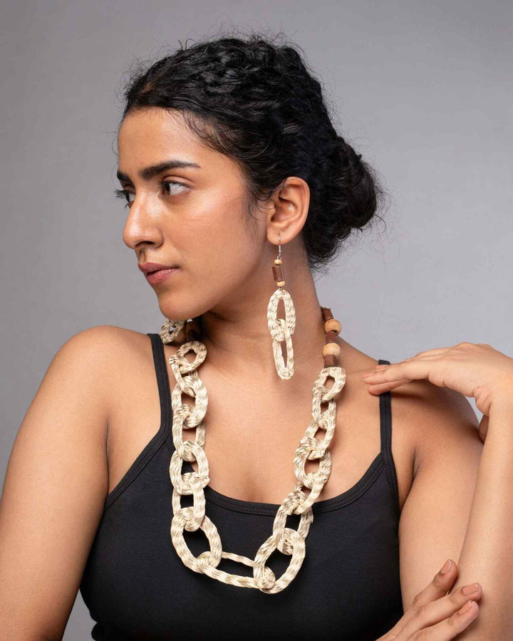 The fashion industry generates a huge amount of cutting waste. About 15% of fabric gets wasted during the cutting of the garment. In this collection, we've Repurposed this waste into beautiful fabric, creating lovely jewelry pieces and contributing to a sustainable society.