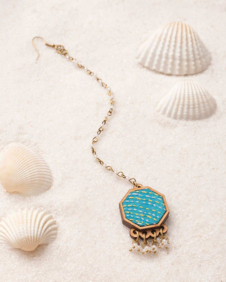 WHE Turquoise Kantha Repurposed Silk Fabric and Wood Maang Tika