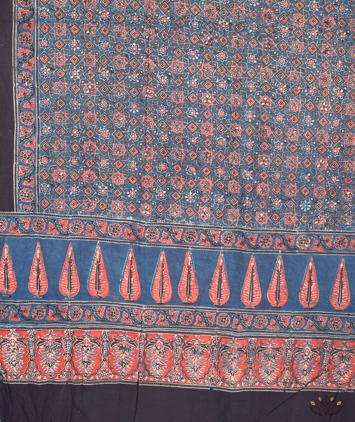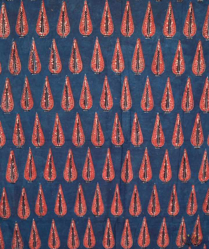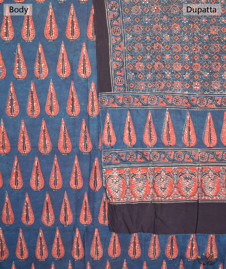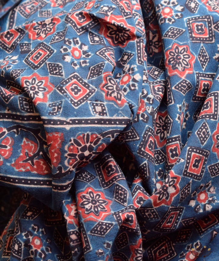 Ajrakh cotton suit piece : Ajrakh cotton suit piece is one of the 100 varieties of product that can be made through using the craft Ajrakh. The final print always has dissimilarities and faded colours which adds to its beauty. To make an Ajrakh silk stole an artisan painstakingly goes through the 20 days process with the same amount of love and enthusiasm. About Ajrakh: Against the dull canvas of the Kachchh desert the rich and bold colours of the textiles are strikingly displayed. Ajrak can trace its roots back to 16th century ancestors who came to India from Sindh, bringing with the craft of Ajrakh printing with them. Ajrakh cloth carries many meanings. The popular story amongst local printers is that Ajrakh means “aaj rakh” i.e “keep it today”. It is also linked to azrakh, the Arabic word for indigo. In addition, A blue plant which thrived in the arid ecology of Kachchh until the 1956 earthquake. 2001’s devastating earthquake severely damaged Bhuj, Dhamadka and other villages and towns all over the Kachchh region. In the wake of this tragedy, the Khatris were brought closer together and a new village was created to rebuild their lives and their craft production, aptly named Ajrakhpur (‘place of Ajrakh’). Today there are Khatris living and working in both villages. Ajrakh block printing follows a lengthy and demanding process. In the first place, they prepare the fabric. Its done by tearing un-dyed fabric into 9 meter lengths, washing it to remove starches, wax and impurities and then dying it with myrobalam. Artisans select a wooden block from their collection of blocks carved with traditional designs. The sound of the wooden block being stamped with force onto the table echoes and sounds almost like a heart beating. It is the sound that the craft is still going strong. This first block is coated in lime coupled with Acacia gum and carefully pressed onto the cloth at regular intervals. It acts as a resist. Myrobalan turns the cloth a yellow colour and works as a mordant, helping to fix the dyes. The cloth is laid flat to dry in the hot sun after being calendered. A resist of lime coupled with gum is applied to define the outline of the design. This is known as rekh. If the cloth is to be double sided, this stage is repeated on the reverse side of the cloth. This first block is coated in lime coupled with Acacia gum and carefully pressed onto the cloth at regular intervals. It acts as a resist. Artisans continue the process by selecting and coating blocks in dye, aligning them with previous prints, and pressing them carefully onto the fabric. Jaggery coupled with gram flour are used for black designs; alum and tamarind for red. After each colour of print, artisans rinse and sun-dry the cloth. After the printing is complete, the cloth is washed, dyed in one of many natural colours, and once again laid in the sun to dry.