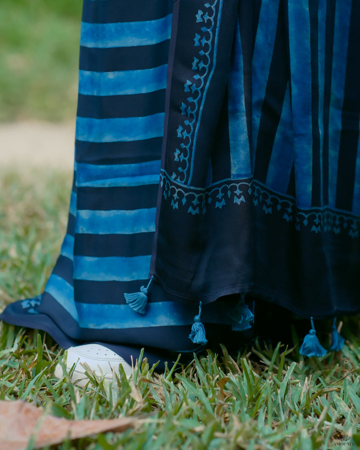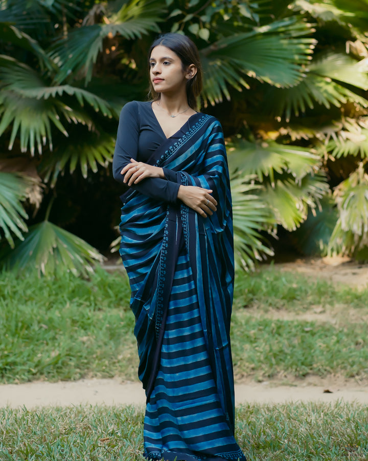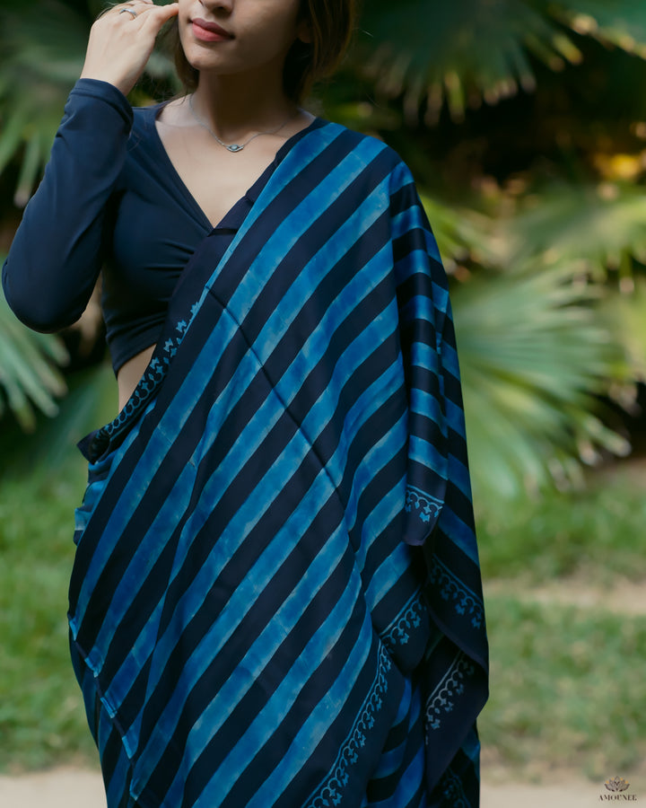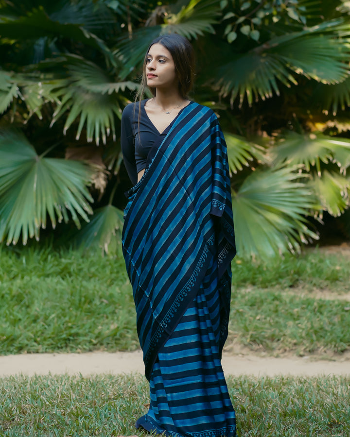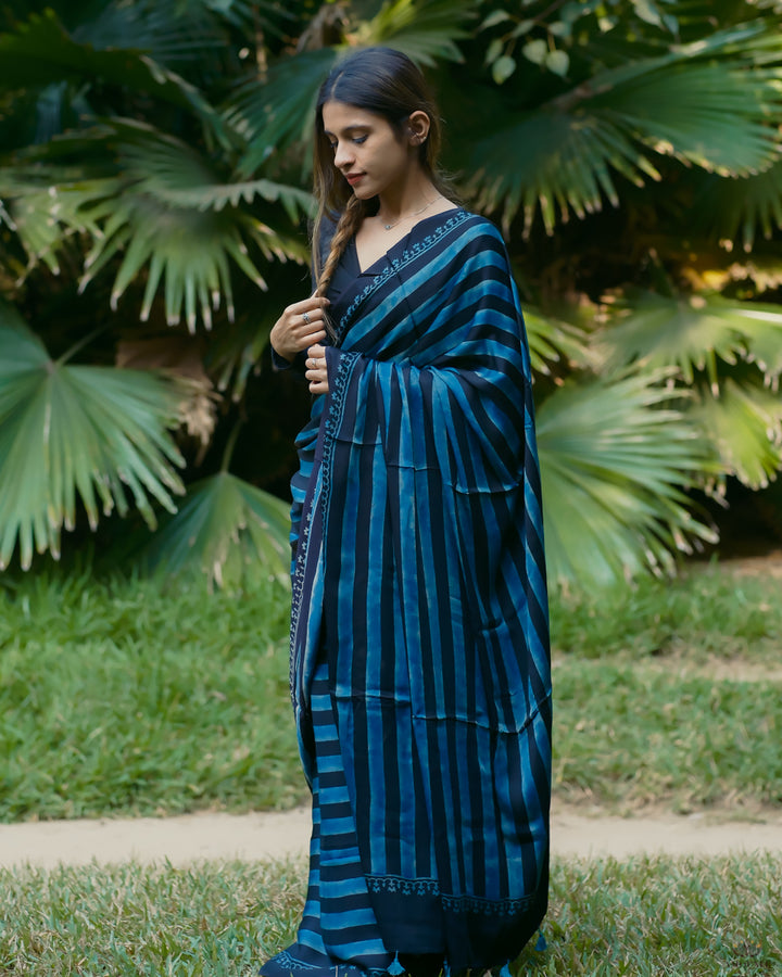 Ajrakh Modal Silk Saree: Ajrakh modal silk saree is one of the 100 varieties of product that can be made through using the craft Ajrakh. The final print always has dissimilarities and faded colours which adds to its beauty. To make an Ajrakh silk saree an artisan painstakingly goes through the 20 days process with the same amount of love and enthusiasm.