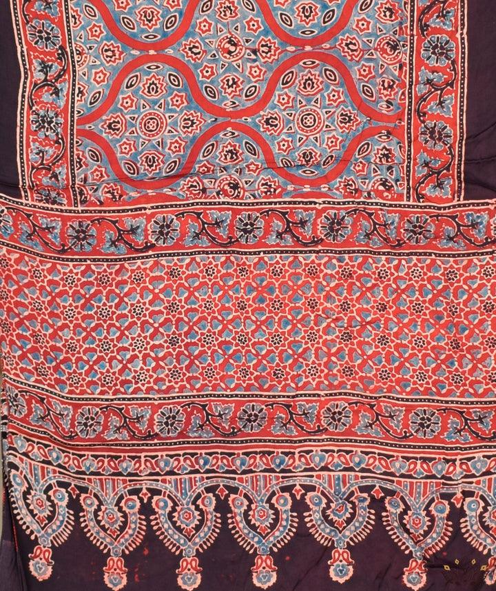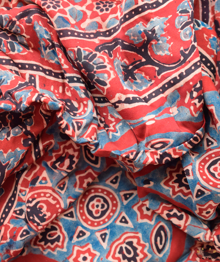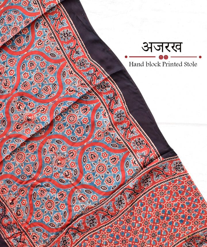 Ajrakh cotton Dupatta: Ajrakh cotton Dupatta is one of the 100 varieties of product that can be made through using the craft Ajrakh. The final print always has dissimilarities and faded colours which adds to its beauty. To make an Ajrak dupatta an artisan painstakingly goes through the 20 days process with the same amount of love and enthusiasm. About Ajrakh: Against the dull canvas of the Kachchh desert the rich and bold colours of the textiles are strikingly displayed. Ajrak can trace its roots back to 16th century ancestors who came to India from Sindh, bringing with the craft of Ajrakh printing with them. Ajrakh cloth carries many meanings. The popular story amongst local printers is that Ajrakh means “aaj rakh” i.e “keep it today”. It is also linked to azrakh, the Arabic word for indigo. In addition, A blue plant which thrived in the arid ecology of Kachchh until the 1956 earthquake. 2001's devastating earthquake severely damaged Bhuj, Dhamadka and other villages and towns all over the Kachchh region. In the wake of this tragedy, the Khatris were brought closer together and a new village was created to rebuild their lives and their craft production, aptly named Ajrakhpur (‘place of Ajrakh’). Today there are Khatris living and working in both villages. Ajrakh block printing follows a lengthy and demanding process. In the first place, they prepare the fabric. Its done by tearing un-dyed fabric into 9 meter lengths, washing it to remove starches, wax and impurities and then dying it with myrobalam. Artisans select a wooden block from their collection of blocks carved with traditional designs. The sound of the wooden block being stamped with force onto the table echoes and sounds almost like a heart beating. It is the sound that the craft is still going strong. This first block is coated in lime coupled with Acacia gum and carefully pressed onto the cloth at regular intervals. It acts as a resist. Myrobalan turns the cloth a yellow colour and works as a mordant, helping to fix the dyes. The cloth is laid flat to dry in the hot sun after being calendered. A resist of lime  coupled with gum is applied to define the outline of the design. This is known as rekh. If the cloth is to be double sided, this stage is repeated on the reverse side of the cloth. This first block is coated in lime coupled with Acacia gum and carefully pressed onto the cloth at regular intervals. It acts as a resist. Artisans continue the process by selecting and coating blocks in dye, aligning them with previous prints, and pressing them carefully onto the fabric. Jaggery coupled with gram flour are used for black designs; alum and tamarind for red. After each colour of print, artisans rinse and sun-dry the cloth. After the printing is complete, the cloth is washed, dyed in one of many natural colours, and once again laid in the sun to dry.