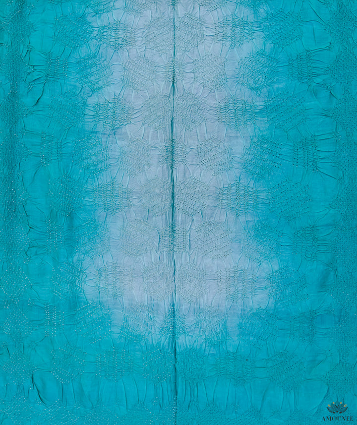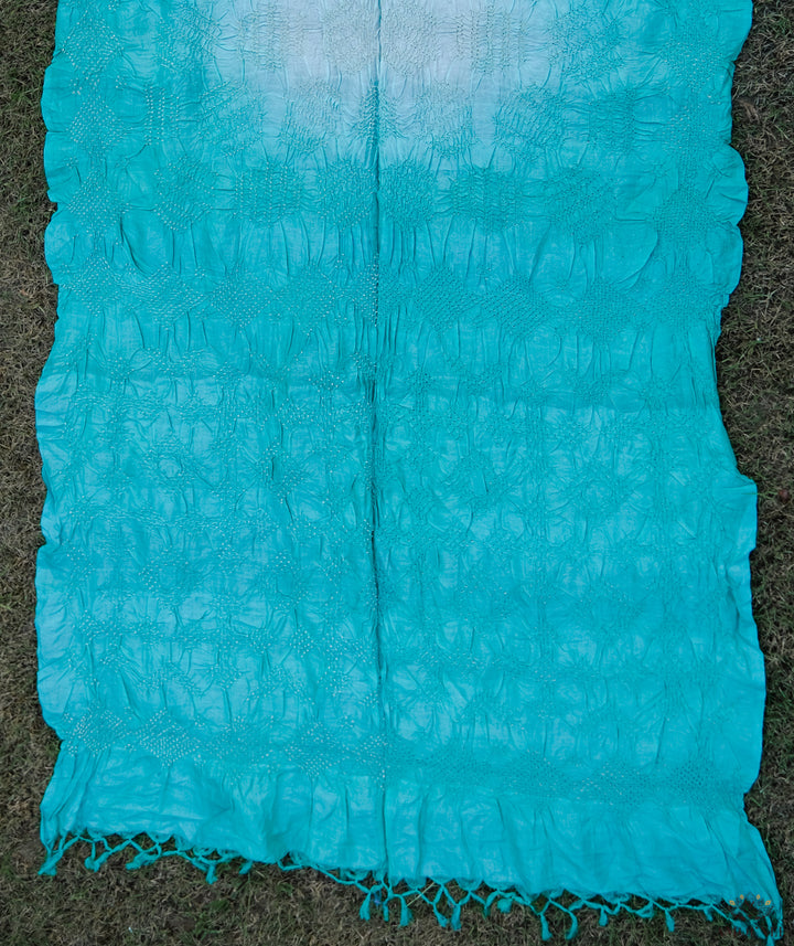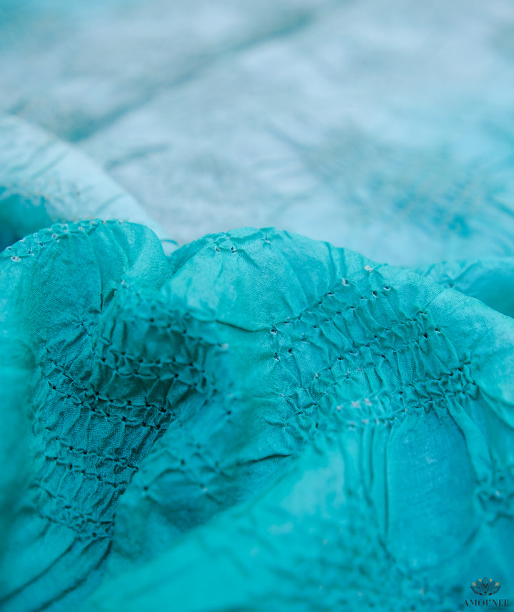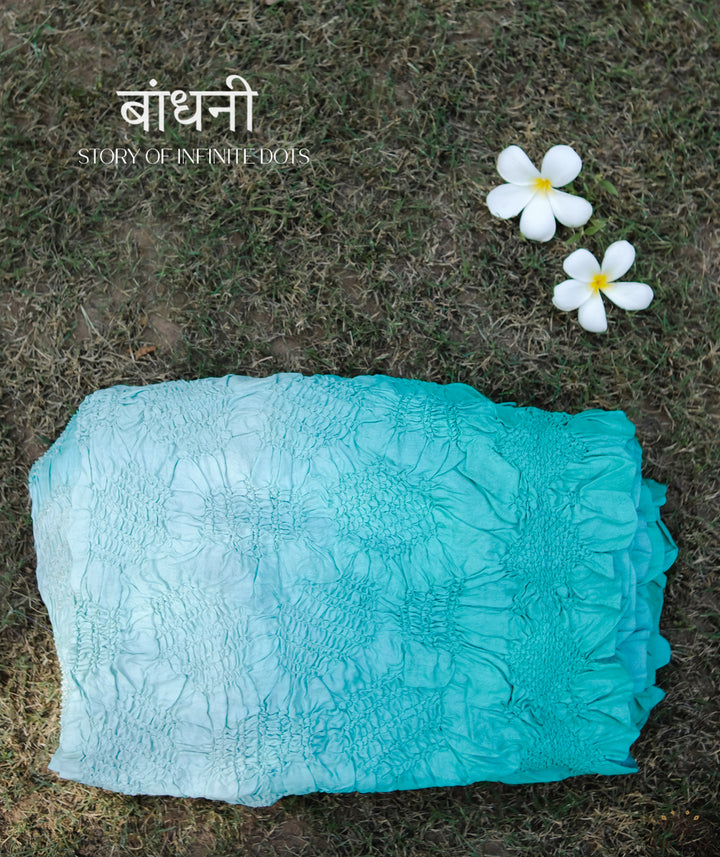 Bandhini silk sarees are one of the oldest form of tie & die art which began about 5000 years ago. The art of Bandhani is as exciting as it’s history. The fabric to be dyed is tied very tightly at different points in knots and then dyed with extraordinary colors. When this tied cloth goes for dyeing, these threads or knots doesn’t let that part catch color & allows it to stay white or whatever color the cloth has. Once the cloth is dyed, it is left for drying in open air. Dyeing is accomplished by the tie-resist method where the patterns are made up of innumerable dots and weaves respectively. Usually men do the dyeing while women do the tying, which is most painstaking with each dot being as tiny as a pin-head. The cloth is first washed and bleached to prepare it for absorbing the dyes. After this, it is then sent to the bandhani, the women who do the tying, lift small portions of the fabric and tightly tie a thread around it. The more minuscule the raised Bandhani – tied textile fabric, the finer the bandhana. The tied textile is then dipped in a light colour first while the tied areas retain the original ground colour. If a second dye is required, the areas to be retained in the first dye are tied for resist and the cloth dipped in a darker dye. This process is repeated, if several colours are to be combined. Drying can take some time depending upon the weather conditions. In monsoon, it takes around 2 days to dry while in summer it takes only 4-5 hours. In winter it takes around 6-7 hours for drying.