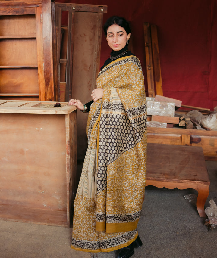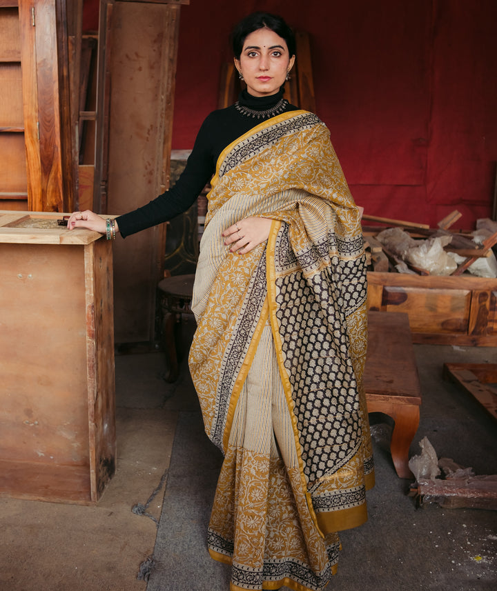 Traditionally, motifs printed at Bagru are large with bold lines, as compared to Sanganer, where sombre colours and fine lines, intricate detailing are practiced. Sanganeri motifs are based on nature, while the motifs of Bagru are more often geometric.