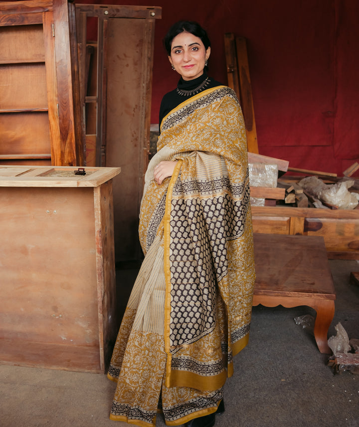 The painstakingly laborious but anciently beautiful process takes around 20 days for a fabric to be completed. The process includes washing - to get rid of the fabric impurities and then Harda is done which leaves a yellow tint. Think of it as a primer. Then the fabric is dried, where the fabric is laid flat in the sun. Then once the colours are mixed - the printing is started. The printing involves three steps, where the outline is printed first with the block and then the insides. Once the printing is completed, the fabric is left for drying. The dried fabric is the washed in cold water and then boiled with alizarine which gives red colour and acts as fastner.