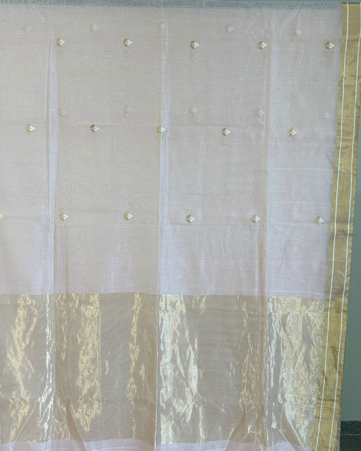 is produced in the town of Chanderi, Madhya Pradesh by weaving in silk and golden Zari in the traditional cotton yarn that results in the creation of the shimmering texture.