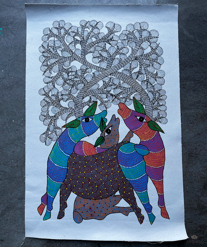 Gond paintings are a form of painting from folk and tribal art that is practiced by one of the largest tribes in India with whom it shares its name. Gond comes from the Dravidian expression, Kond which means ‘the green mountain’. While Gond paintings are considered to be from predominantly from Madhya Pradesh, it is also quite common in Andhra Pradesh, Maharashtra, Chhatisgarh and Odisha. Gond art has become so predominant that the Government of India has stepped in to preserve their art form for future generations to enjoy.