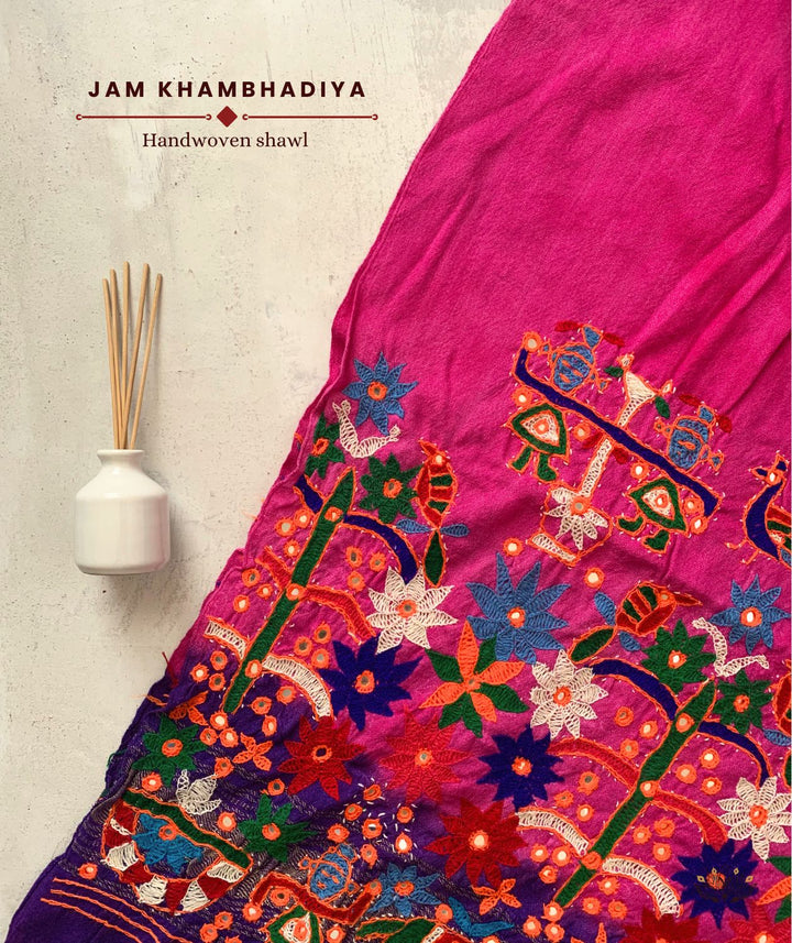 While the men do the weaving, the women are responsible for preparing the warp thread. Since the yarns are too battle when bought, it is first starched in a combination of wheat flour and wild onions which is also an insect deterrent. Once the yarns are starched and dried, it is combed and prepped for the loom. The women swiftly moves her wand or ‘kadani’ over a wooden frame called chaukta. She’s preparing the warp thread, putting together a bundle of exactly 1600 threads of 50 meters each that will be used to create a 39inch width shawl. It will take her six hours of work for about two days to finish the job. Yarn is also prepared into a spindle by some. The yarn comes from Bhujodi, Ludhiana, Rajasthan and Ahmedabad and includes desi and acrylic wool (Marino and local wool), sutar, silk, dori and cotton each used to make an end product catering a different customer. The weft yarn is then prepared by rolling on to small bobbins from the hanks. It is then laid on the loom, where the long thread tana, intersects with bana, the shorter one, hence weaving here is called ‘tana bana‘. In Kutch, two types of shuttle looms are in use, a pit loom, which is on ground level and a shuttle loom that is slightly more structured. The work done in the loom depends on the result one is aiming for. A simple shawl that involves only weaving can take about two days to create and at least 5-6 shawls of the same model will be weaved each time, making a minimum weaving stint last for at least 10 to 12 days. Shawls with intricate designs can take months on end. It was one such magnificently patterned Dhablo or shawl that Vishram Valji, Ramji’s father worked on for an entire year that won him the President’s award in 1974.