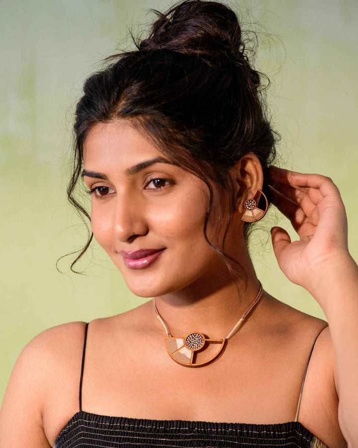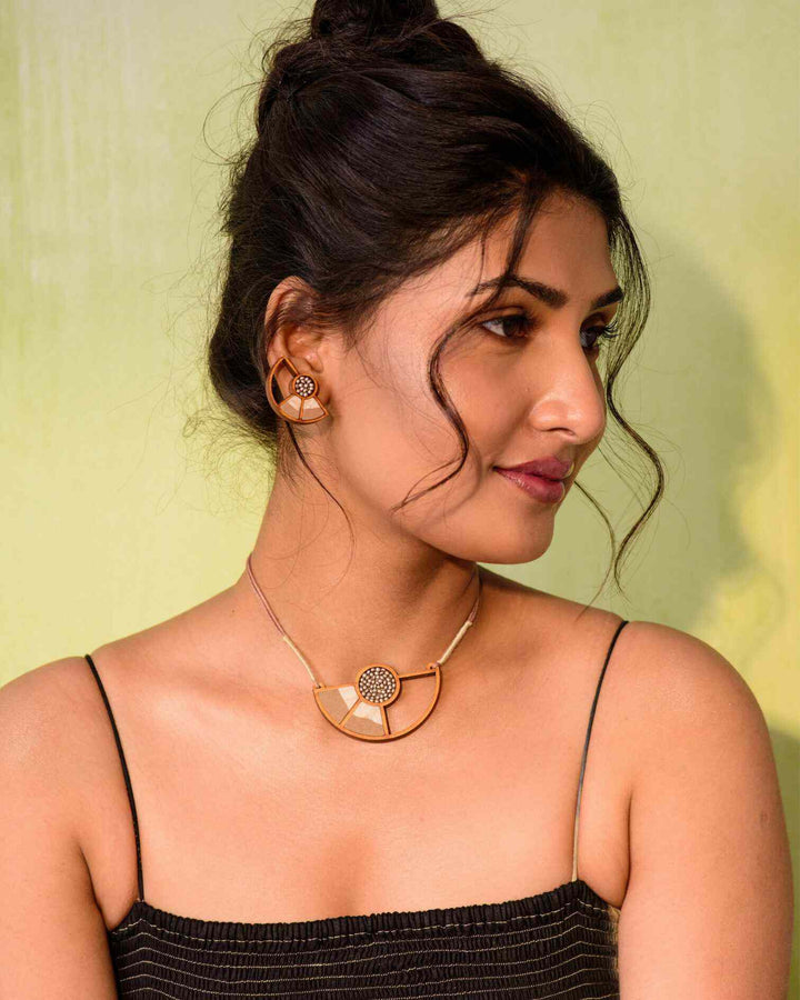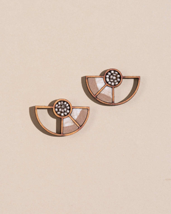 WHE Beige Geometrical Upcycled Fabric and Repurposed Wood Earring