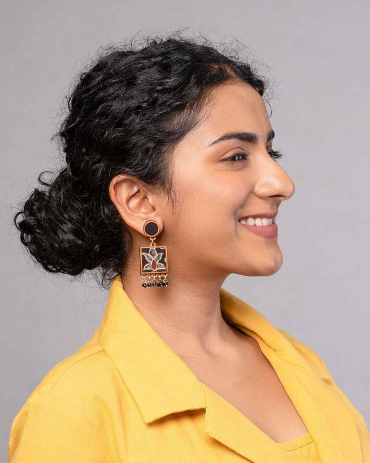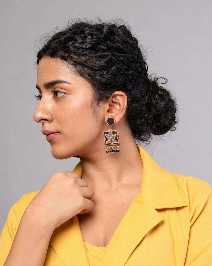 WHE Black Ajrakh Hand Block Printed Repurposed Fabric and Wood Earrings