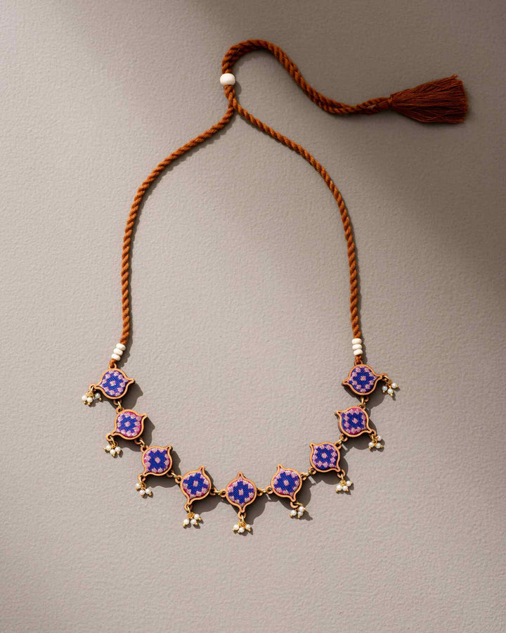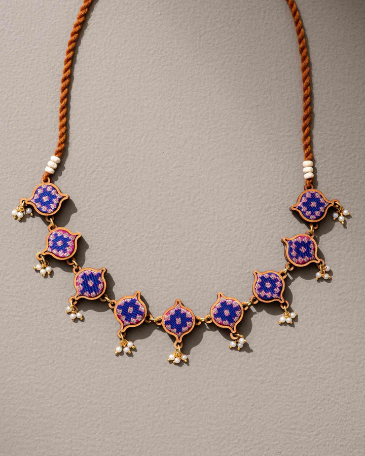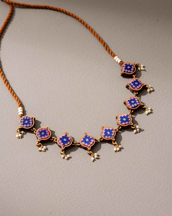 WHE Blue Brocade Festive Repurposed Fabric and Wood Adjustable Necklace