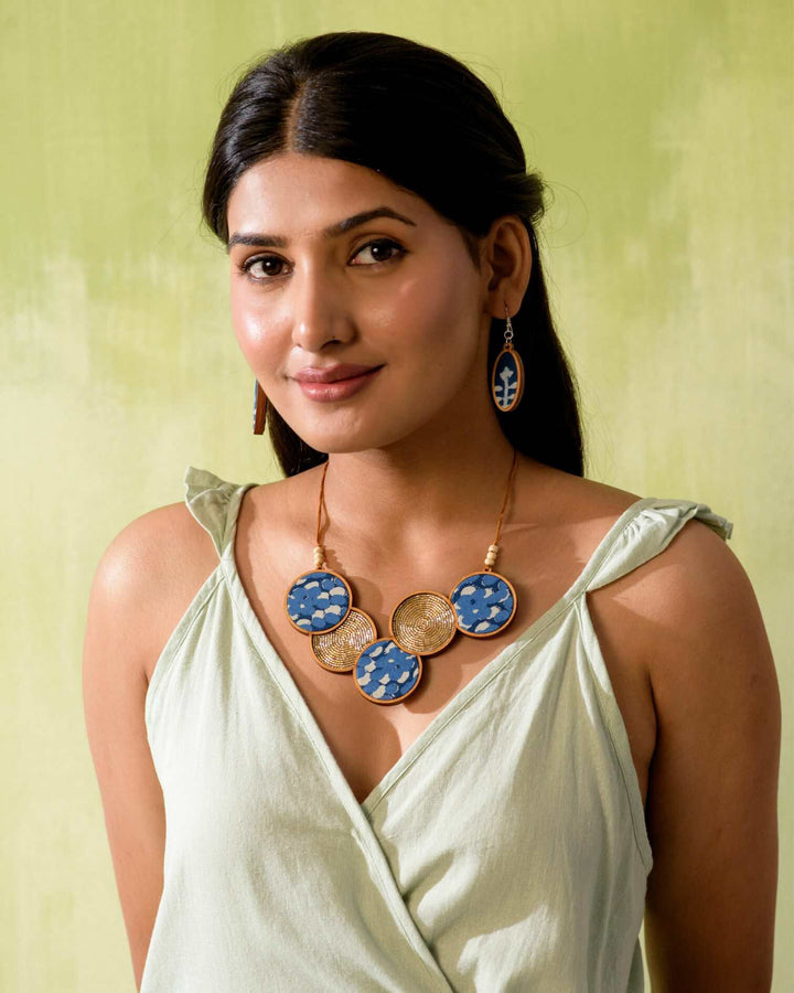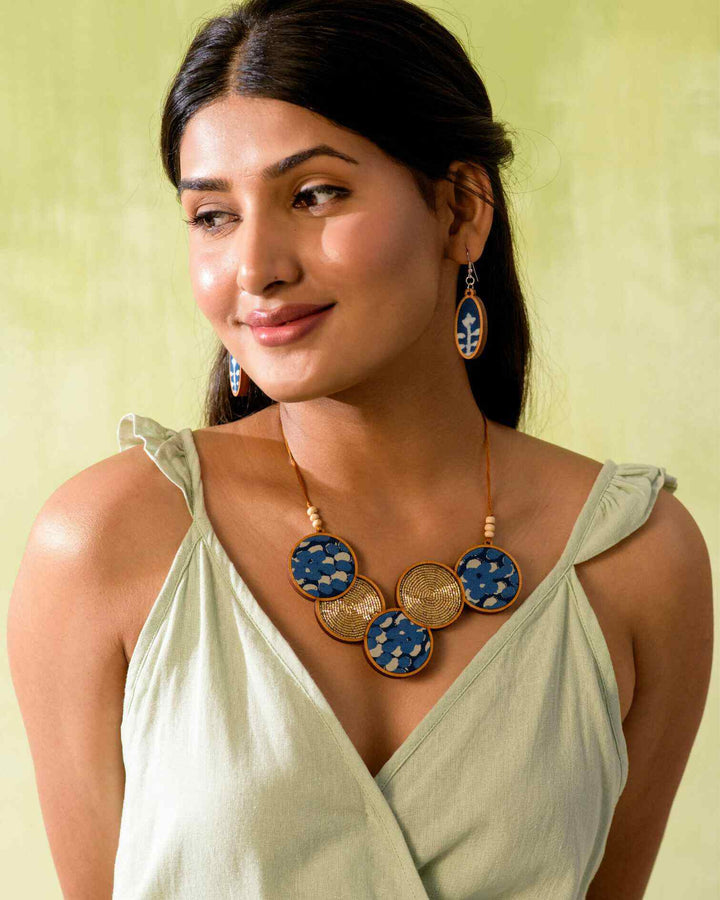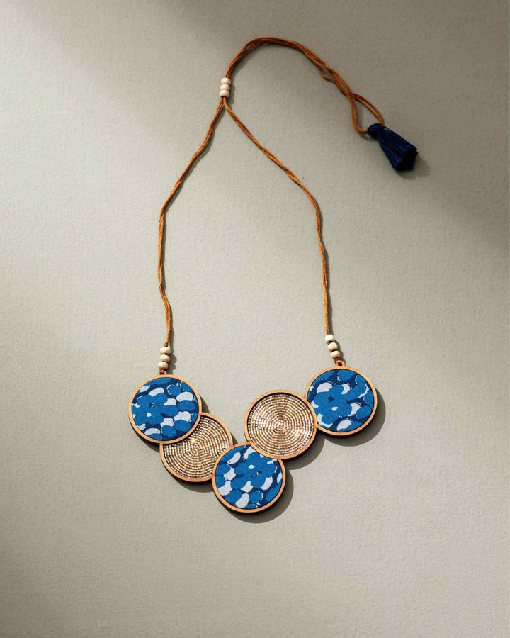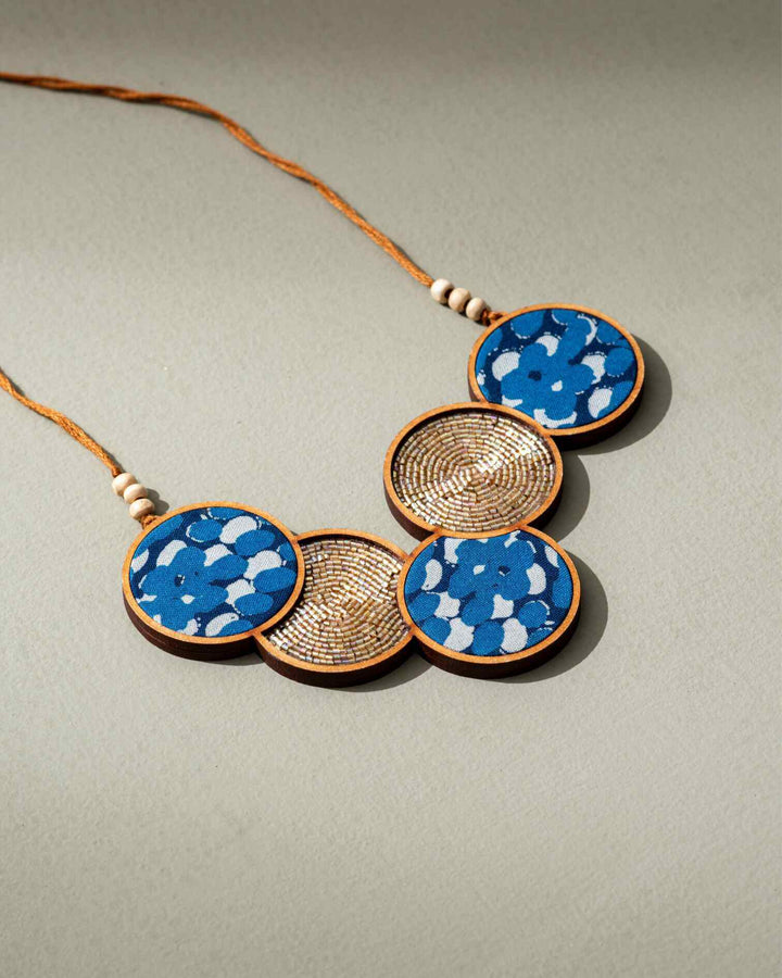 WHE Blue Connected Circle Upcycled Fabric and Repurposed Wood Necklace
