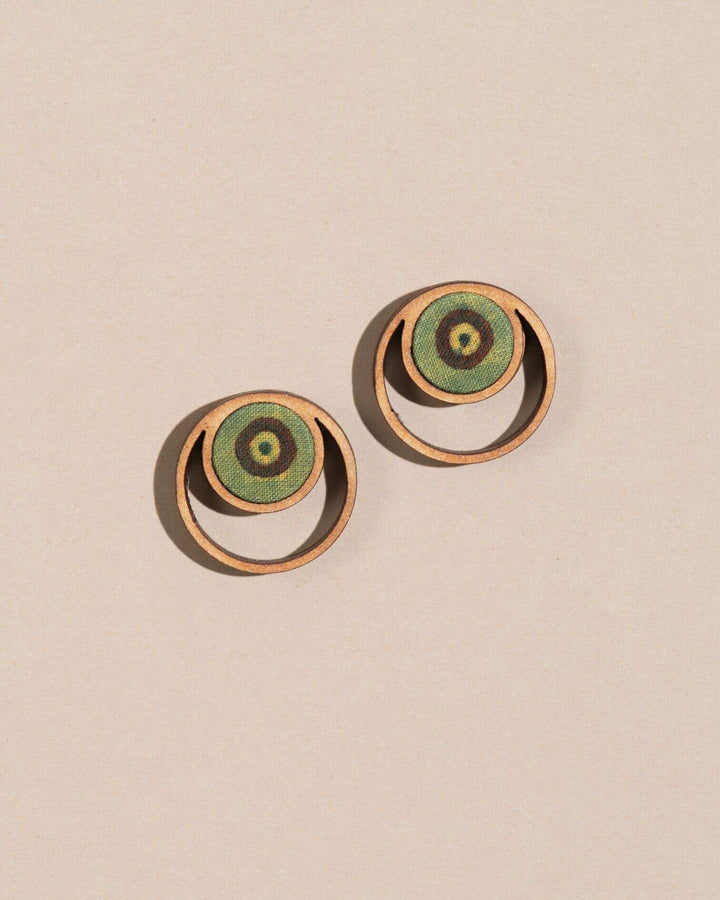 Whe Green Ajrakh Fabric and Repurposed Wood Stud Earrings