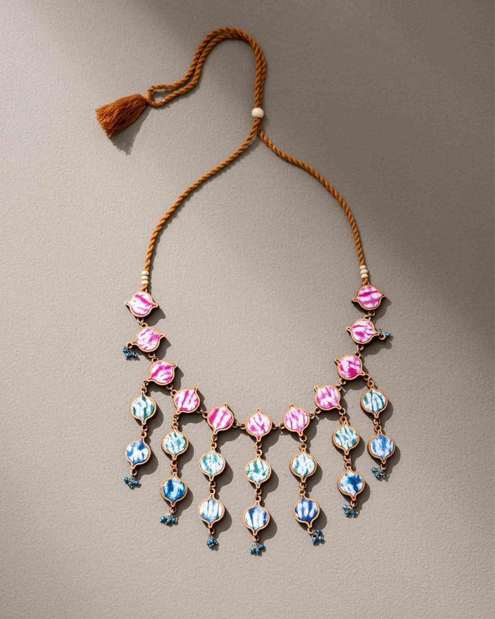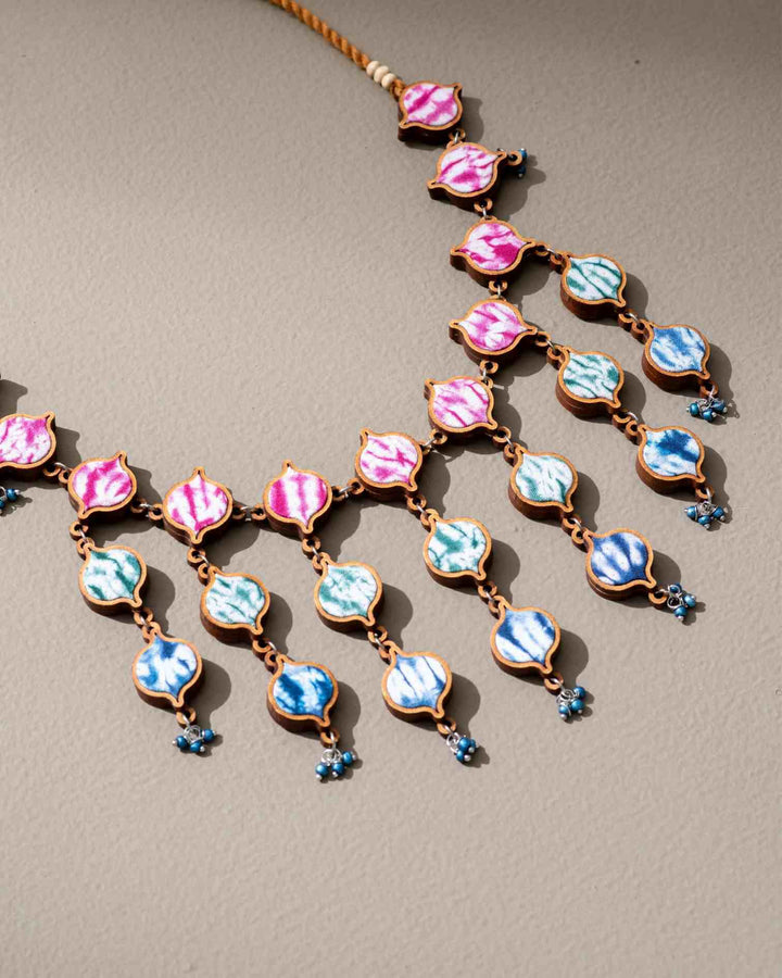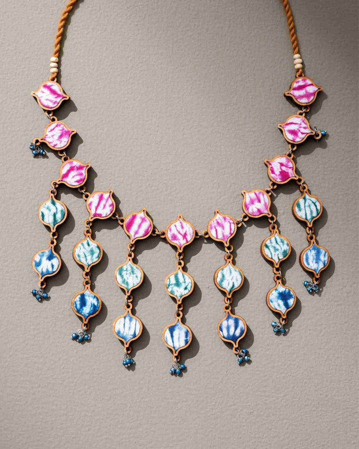 WHE Handcrafted Multicolor Tie and Dye Repurposed Wood and Fabric Statement Necklace
