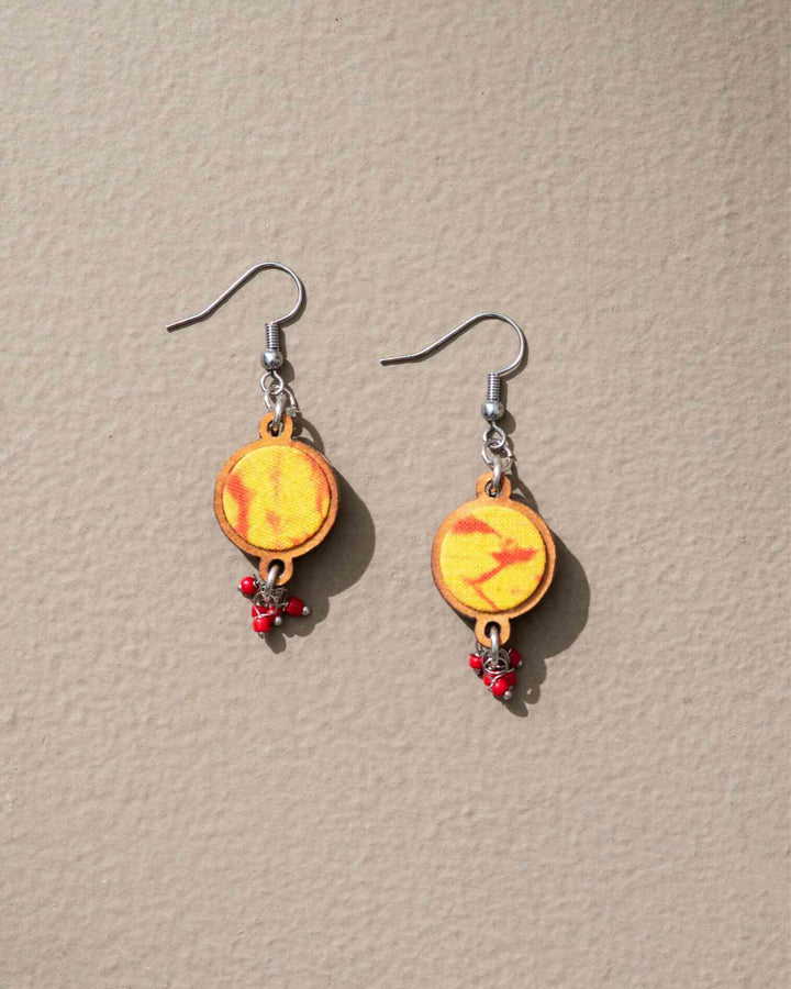 WHE Handcrafted Yellow Orange Tie and Dye Repurposed Wood and Fabric danglers