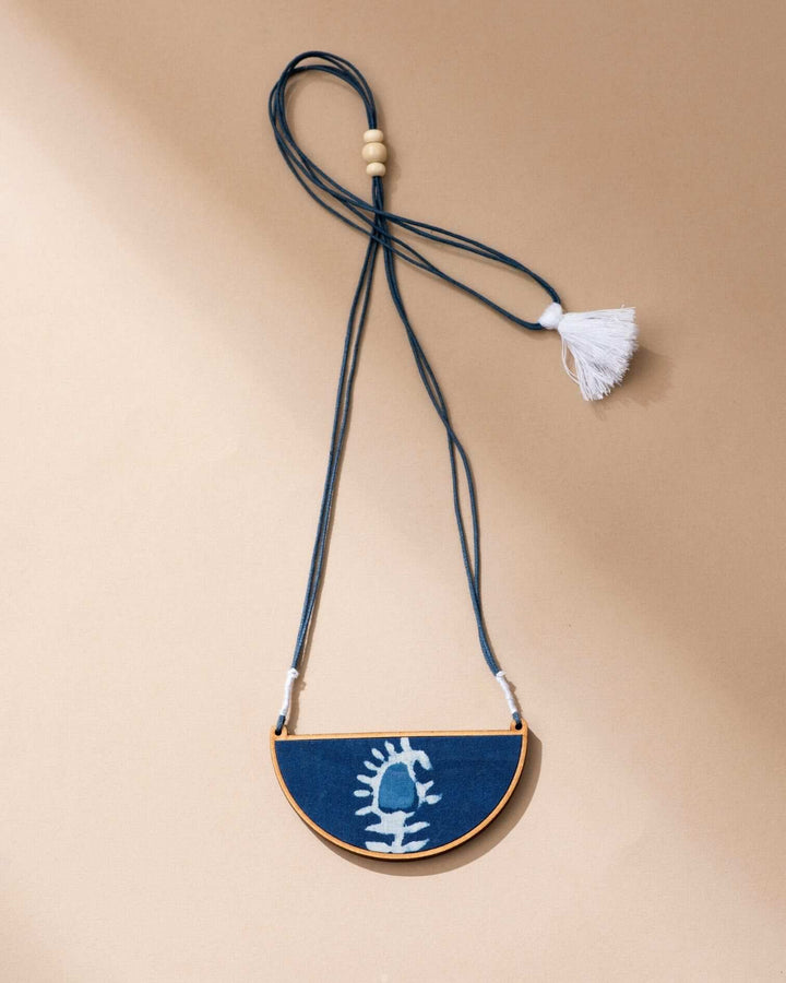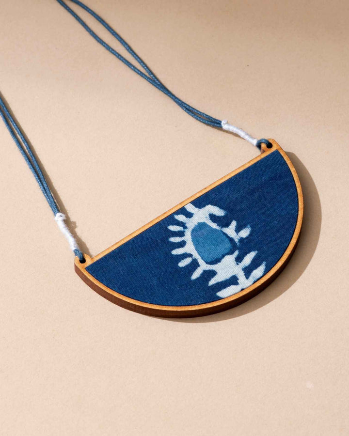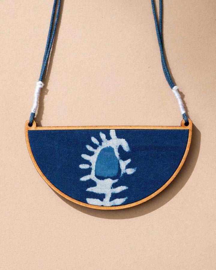 WHE Indigo Upcycled Fabric and Repurposed Wood Semi Circle Necklace
