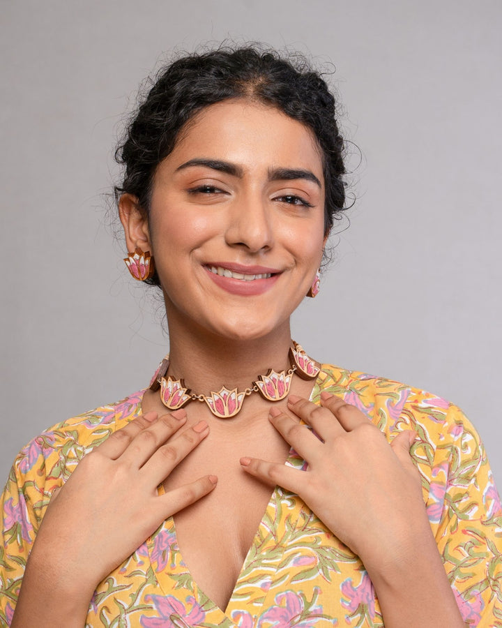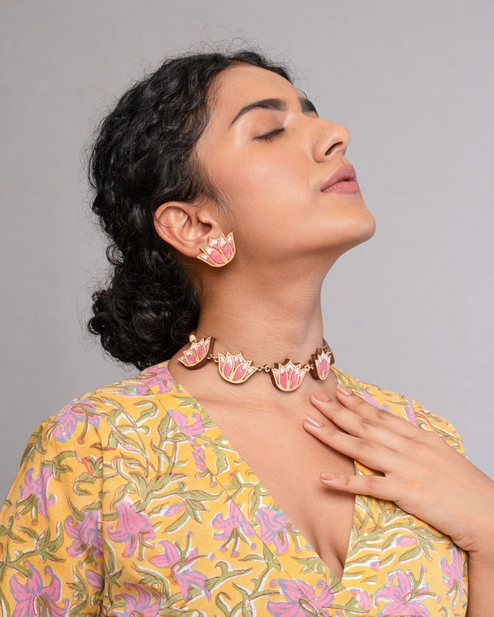 WHE Pink Bloom Lotus Repurposed Fabric and Wood Earrings