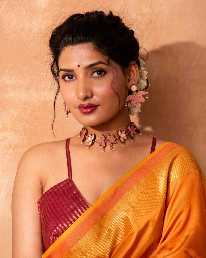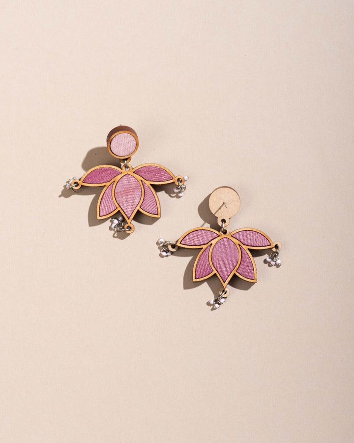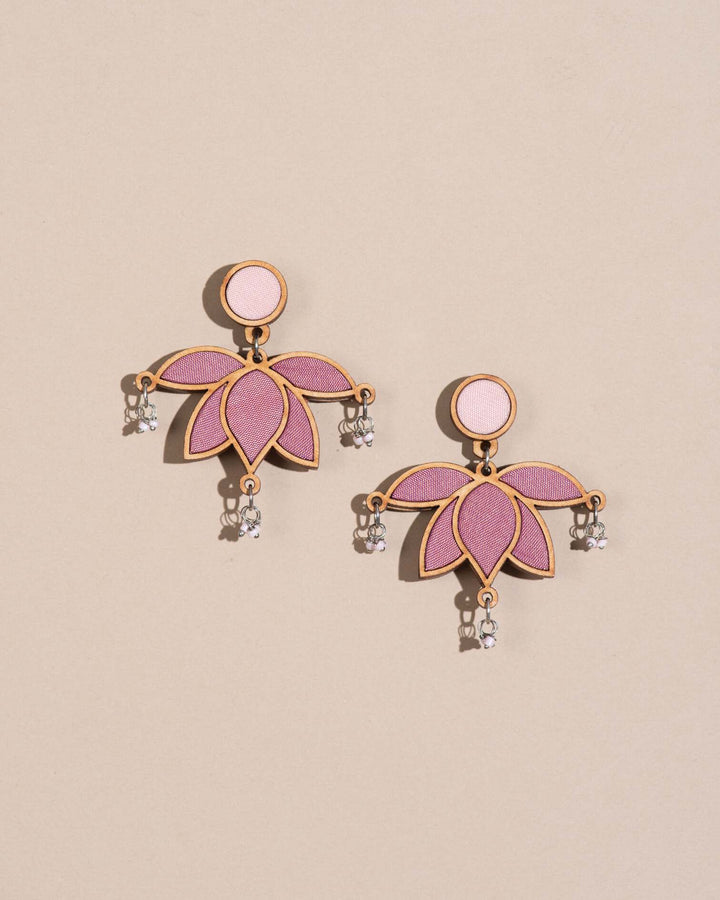 WHE Pink Festive Lotus Upcycled Fabric and Repurposed Wood Statement Earrings