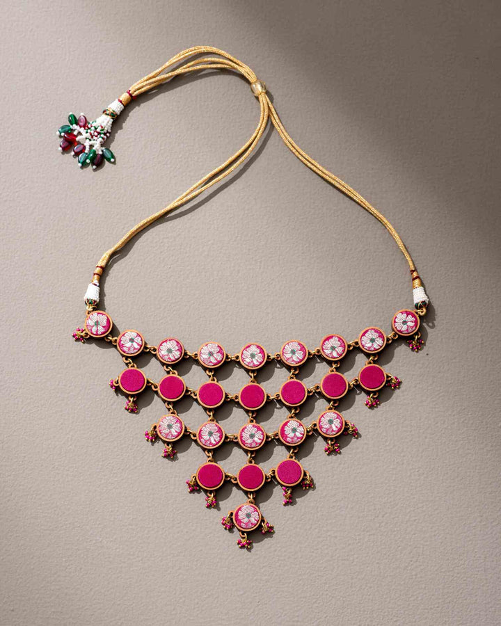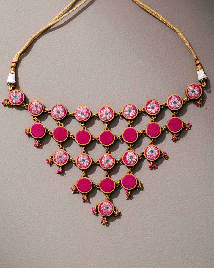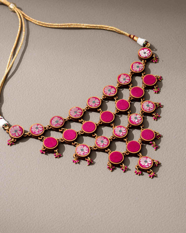 WHE Pink Pure Banarasi Upcycled Fabric and Repurposed Wood Adjustable Statement Necklace