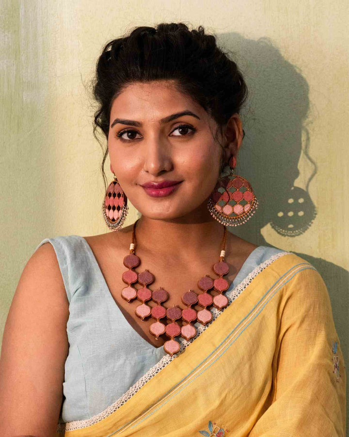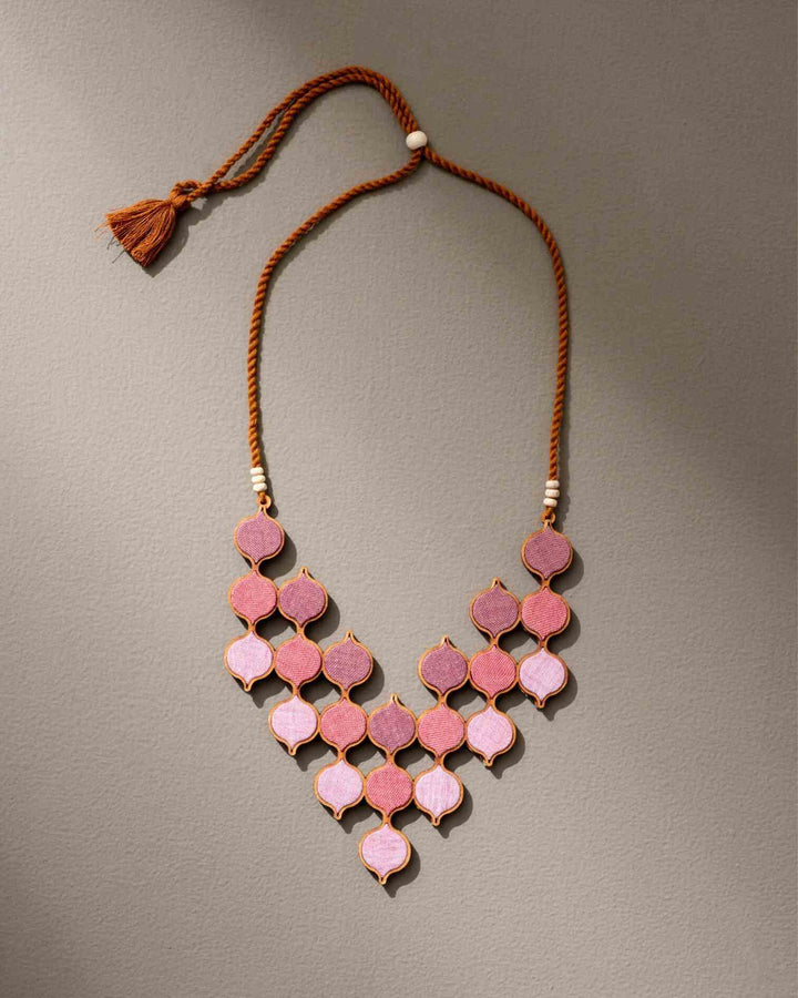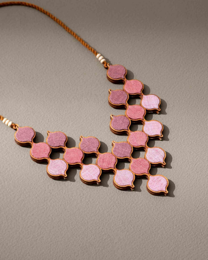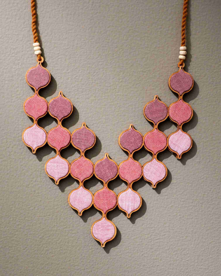 WHE Shades of Pink Repurposed Fabric and Wood Statement Necklace with Adjustable Length